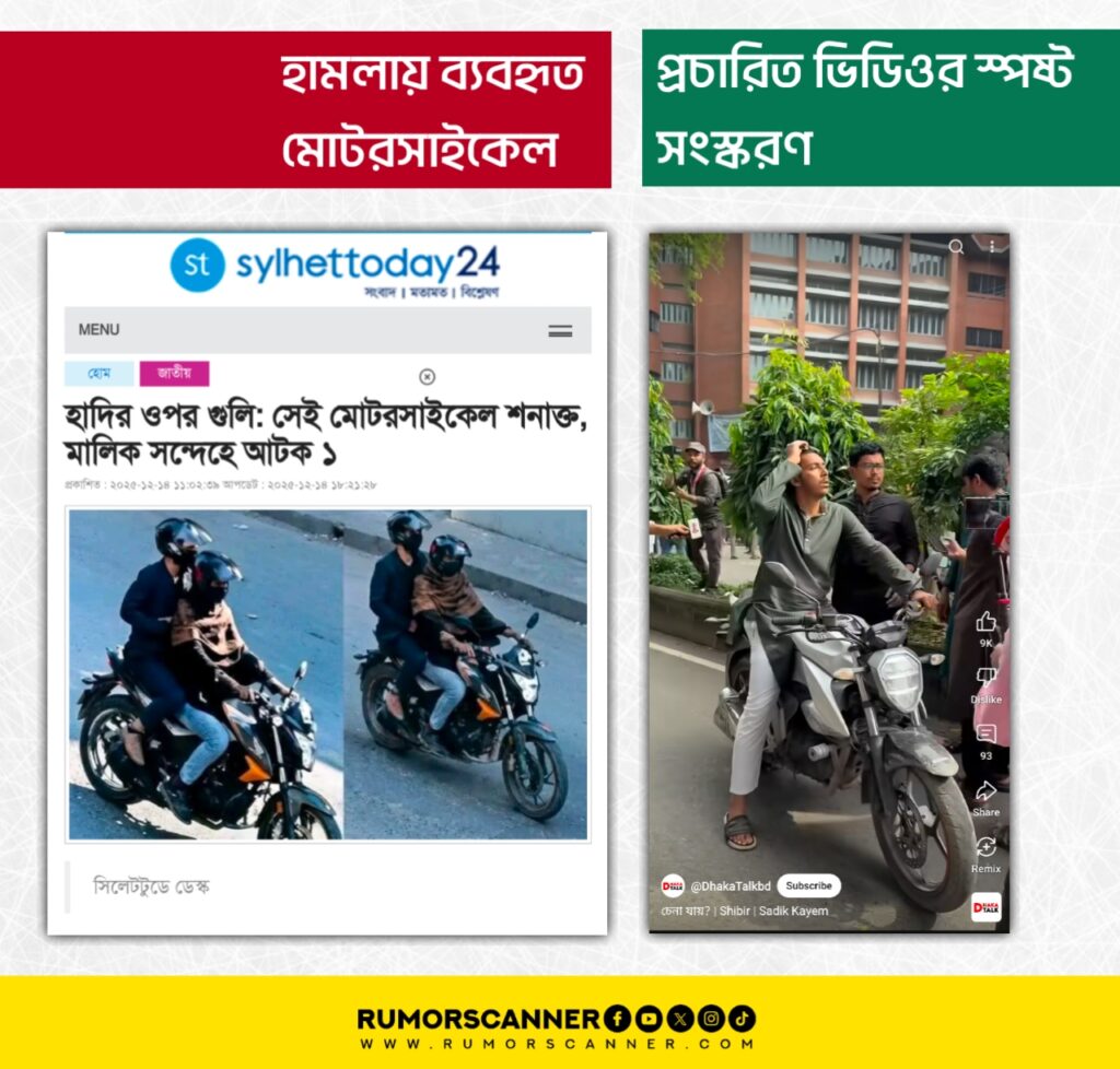 আলোচিত দাবিটির বিষয়ে অনুসন্ধানে হাদিকে হামলার ঘটনায় ব্যবহৃত মোটরসাইকেলের স্পষ্ট ছবি সংবলিত একটি প্রতিবেদন খুঁজে পাওয়া যায়। পাশাপাশি আলোচিত দাবিতে প্রচারিত ভিডিওটির একটি স্পষ্ট সংস্করণ বা মূল ভিডিওটিও খুঁজে পাওয়া যায়। উভয় সূত্র সূক্ষ্মভাবে পর্যালোচনা করে মোটরসাইকেল দুটির মধ্যে পার্থক্য লক্ষ্য করা যায়।