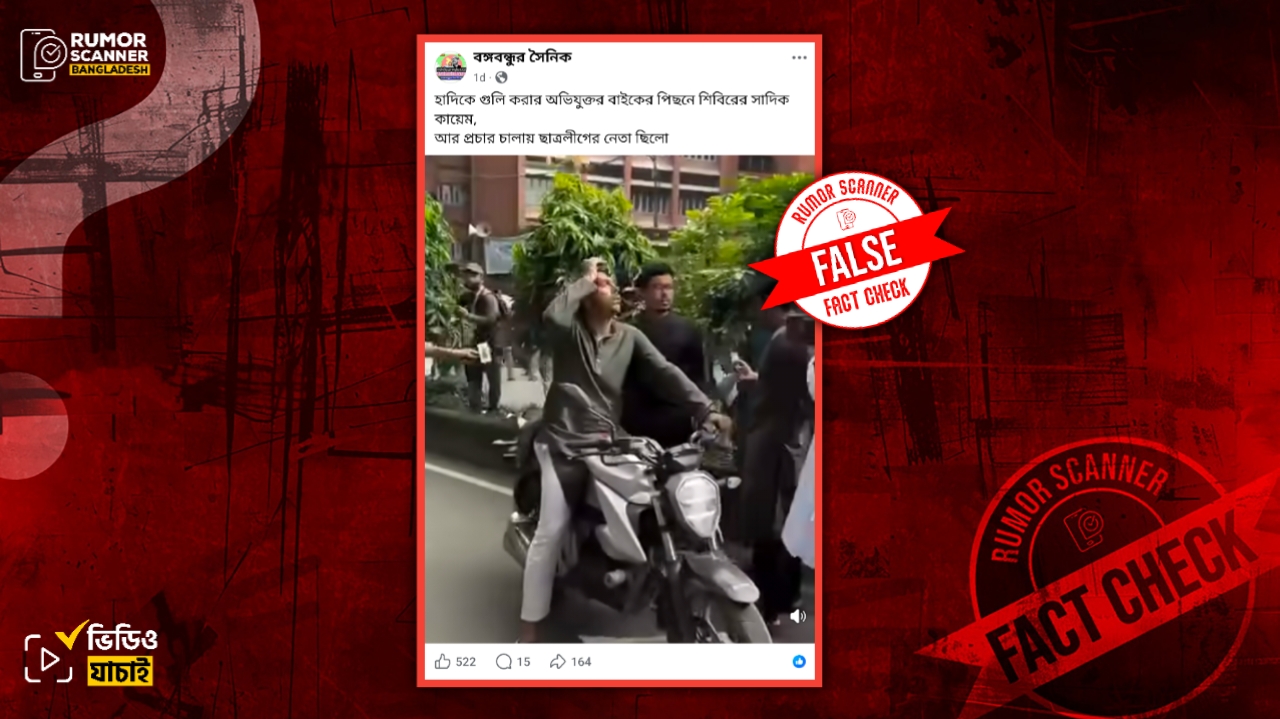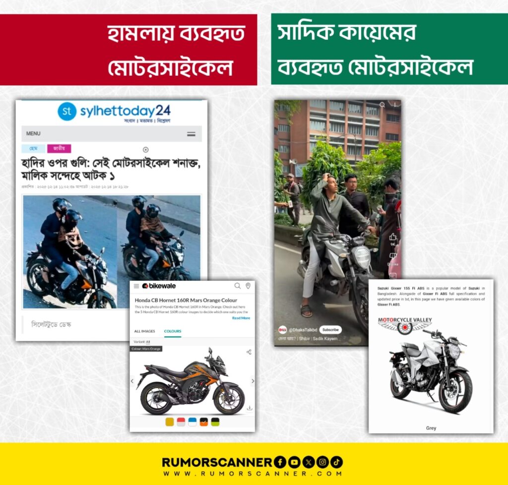 রিউমর স্ক্যানার টিমের অনুসন্ধানে দেখা যায়, সাদিক কায়েমকে শরিফ ওসমান হাদির ওপর হামলায় ব্যবহৃত মোটরসাইকেলে দেখতে পাওয়া দাবিতে প্রচারিত তথ্যটি সঠিক নয়। প্রকৃতপক্ষে, হাদির ওপর হামলা ব্যবহৃত মোটরসাইকেল এবং সাদিক কায়েমের ব্যবহৃত মোটরসাইকেল দুটি ভিন্ন কোম্পানির। এছাড়াও হামলার ঘটনায় সন্দেহভাজন ব্যক্তি এবং সাদিক কায়েমকে বাইকে বহনকারী ব্যক্তিও এক নন।