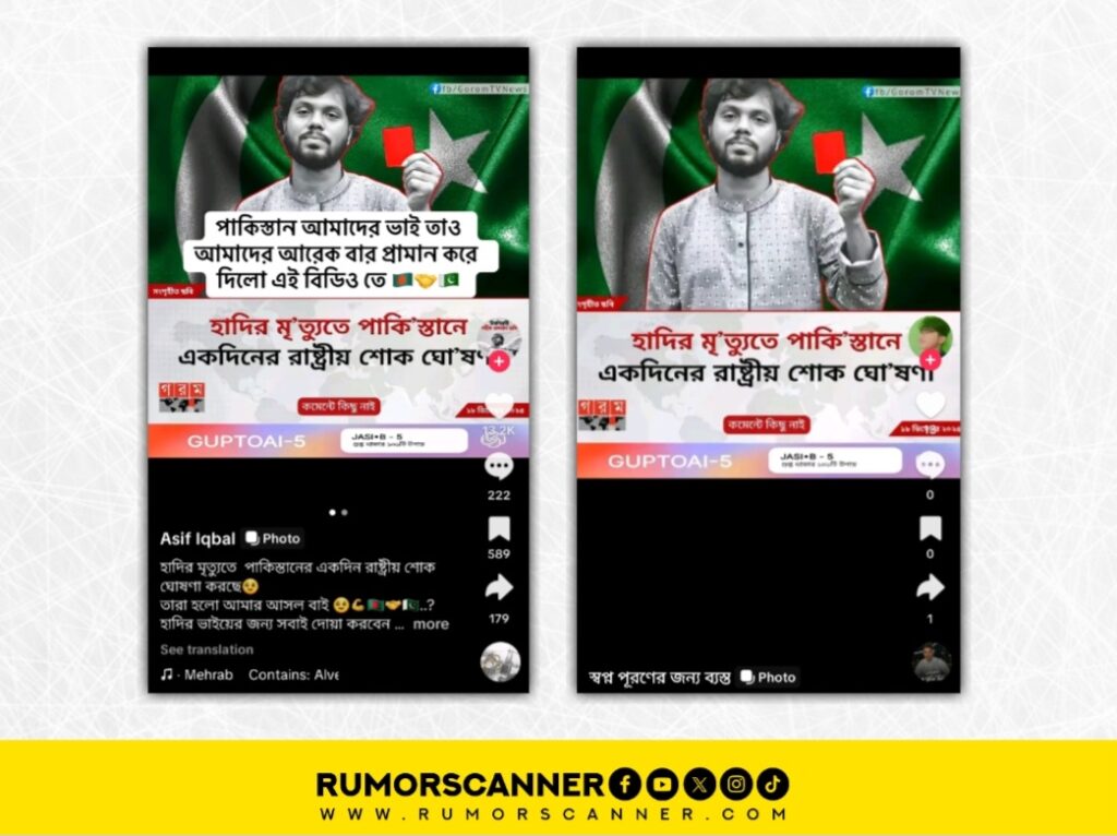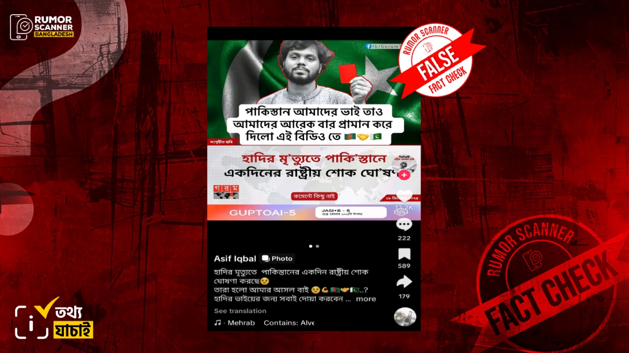 সুতরাং, ‘হাদির মৃ’ত্যুতে পাকি’স্তানে একদিনের রাষ্ট্রীয় শোক ঘো’ষণা’ শীর্ষক দাবিতে প্রচারিত তথ্যটি মিথ্যা।