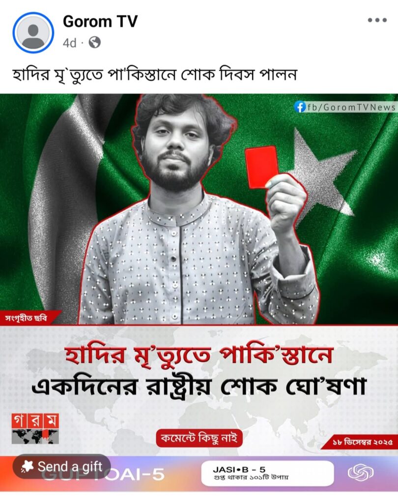 গত ১২ ডিসেম্বর দুপুরে ইনকিলাব মঞ্চের মুখপাত্র শরিফ ওসমান হাদি ঢাকার পুরানা পল্টনের বক্স কালভার্ট রোডে গুলিবিদ্ধ হন। এরপর সিঙ্গাপুরে চিকিৎসাধীন অবস্থায় গত ১৮ ডিসেম্বর তিনি মৃত্যুবরণ করেন। এই ঘটনার পর গত ১৯ ডিসেম্বর থেকে ‘হাদির মৃ’ত্যুতে পাকি’স্তানে একদিনের রাষ্ট্রীয় শোক ঘো’ষণা’ শিরোনামে শরিফ ওসমান হাদির ছবিযুক্ত একটি ফটোকার্ড সামাজিক যোগাযোগ মাধ্যমে প্রচার করা হয়েছে।