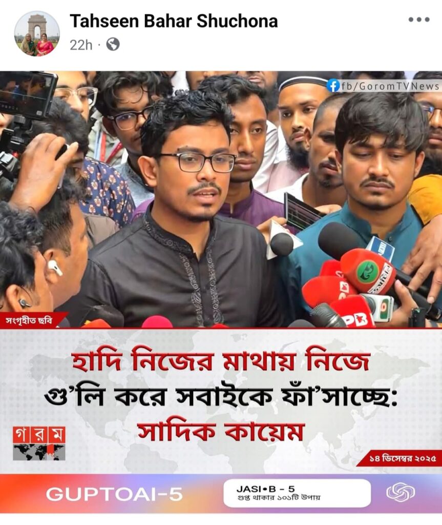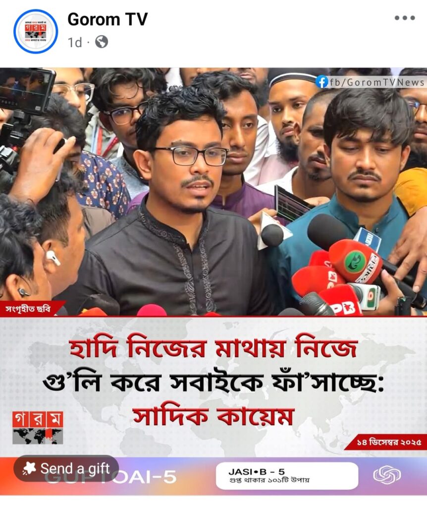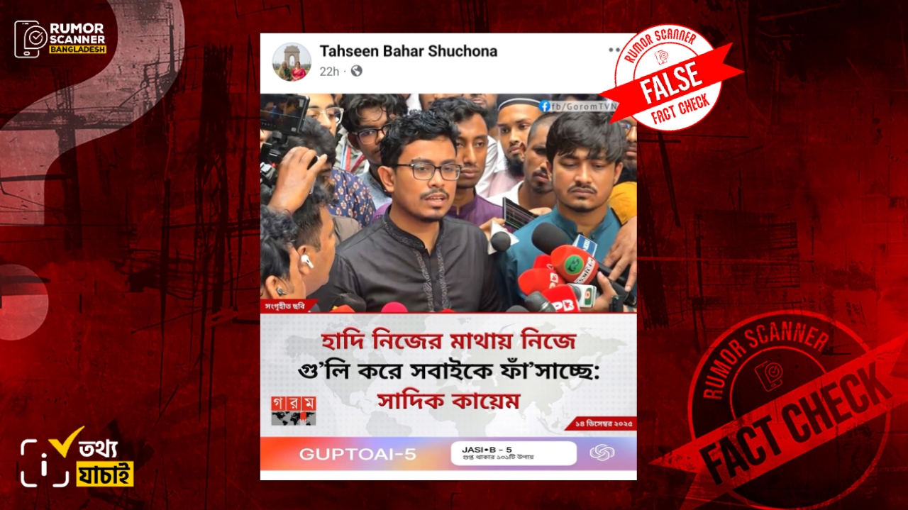 সুতরাং, সাদিক কায়েম ‘হাদি নিজের মাথায় নিজে গুলি করে সবাইকে ফাঁসাচ্ছে’ শীর্ষক মন্তব্য করেছেন বলে প্রচারিত তথ্যটি মিথ্যা।