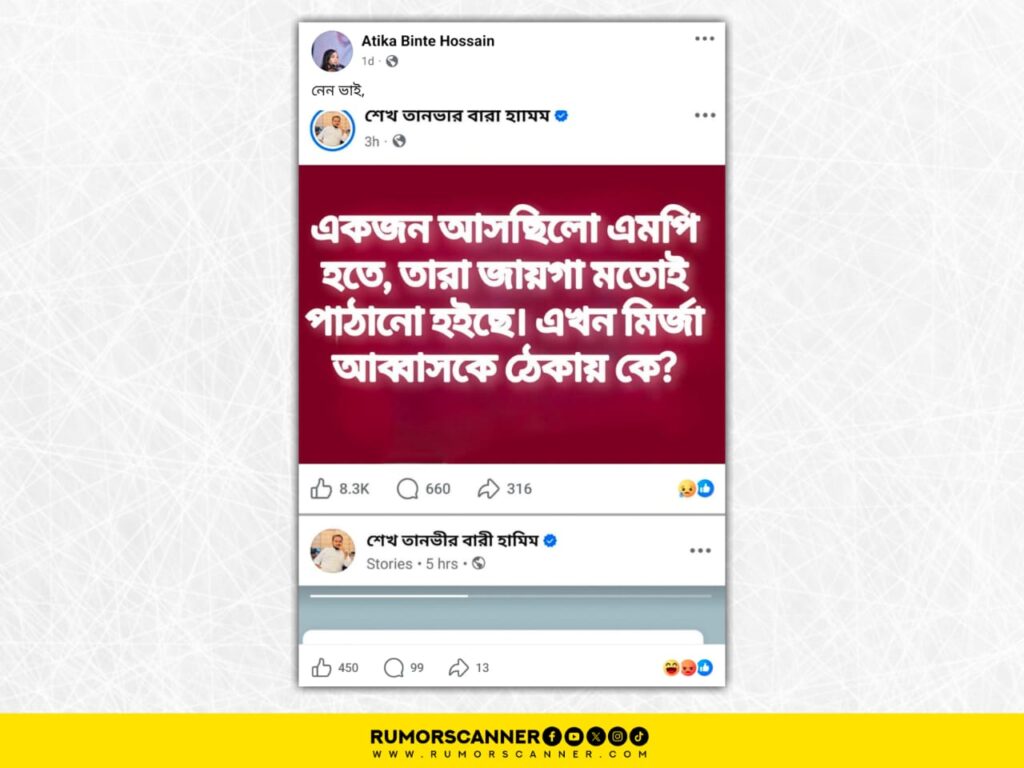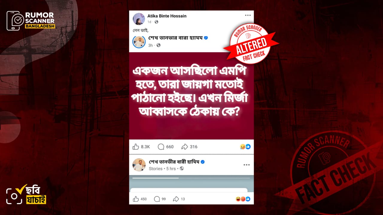 রিউমর স্ক্যানার টিমের অনুসন্ধানে জানা যায়, ওসমান হাদি ও মির্জা আব্বাসকে জড়িয়ে ছাত্রদল নেতা শেখ তানভীর বারী হামিম এমন কোনো ফেসবুক পোস্ট করেননি। প্রকৃতপক্ষে, ডিজিটাল প্রযুক্তির সহায়তায় তার ভেরিফায়েড ফেসবুক প্রোফাইলে থাকা একটি পোস্টের লেখা বিকৃত করে আলোচিত ওই পোস্টের স্ক্রিনশট তৈরি করা হয়েছে।