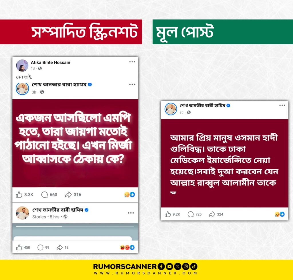অর্থাৎ, ছাত্রদল নেতা শেখ তানভীর বারী হামিমের একটি ভিন্ন পোস্টের স্ক্রিনশট সম্পাদনা করেই আলোচিত দাবিটি প্রচার করা হয়েছে।