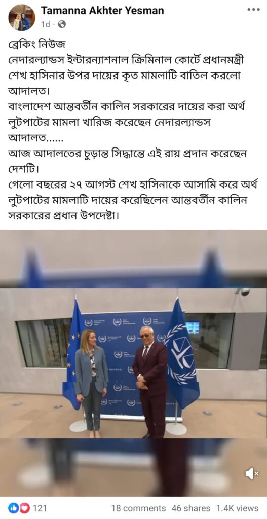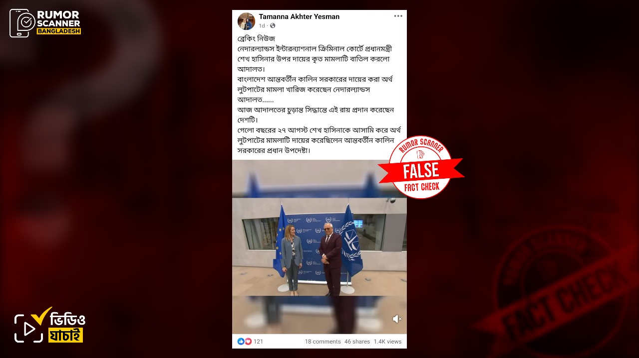 গত ১৪ সেপ্টেম্বর, “ব্রেকিং নিউজ নেদারল্যান্ডস ইন্টারন্যাশনাল ক্রিমিনাল কোর্টে প্রধানমন্ত্রী শেখ হাসিনার উপর দায়ের কৃত মামলাটি বাতিল করলো আদালত। বাংলাদেশ আন্তবর্তীন কালিন সরকারের দায়ের করা অর্থ লুটপাটের মামলা খারিজ করেছেন নেদারল্যান্ডস আদালত…… আজ আদালতের চুড়ান্ত সিদ্ধান্তে এই রায় প্রদান করেছেন দেশটি। গেলো বছরের ২৭ আগস্ট শেখ হাসিনাকে আসামি করে অর্থ লুটপাটের মামলাটি দায়ের করেছিলেন আন্তবর্তীন কালিন সরকারের প্রধান উপদেষ্টা।” ক্যাপশনে একটি ভিডিও সামাজিক যোগাযোগ মাধ্যমে প্রচার করা হয়েছে।
