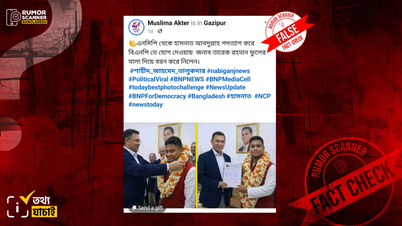 সম্প্রতি জাতীয় নাগরিক পার্টির (এনসিপি) দক্ষিণাঞ্চলের মুখ্য সংগঠক ও কুমিল্লা-৪ (দেবীদ্বার) আসনে জামায়াত-এনসিপি জোটের প্রার্থী হাসনাত আবদুল্লাহ ও বিএনপির চেয়ারম্যান তারেক রহমানের একাধিক ছবি যুক্ত করে ‘এনসিপি থেকে হাসনাত আবদুল্লাহ পদত্যাগ করে বিএনপি তে যোগ দেওয়ায় জনাব তারেক রহমান ফুলের মালা দিয়ে বরন করে নিলেন।’ শীর্ষক দাবিতে ইন্টারনেটে বিভিন্ন প্লাটফর্মে প্রচার করা হয়েছে৷