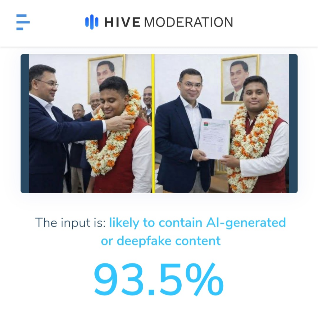 পরবর্তীতে, আলোচিত দাবিতে প্রচারিত ছবিগুলোর বিষয়ে নিশ্চিত হতে এআই কনটেন্ট শনাক্তকারী প্ল্যাটফর্ম ‘Hive Moderation’ এর মাধ্যমে ছবিটি পরীক্ষা দেখা যায়, ছবিটি এআই দিয়ে তৈরি হওয়ার সম্ভাবনা ৯৩.৫ শতাংশ।