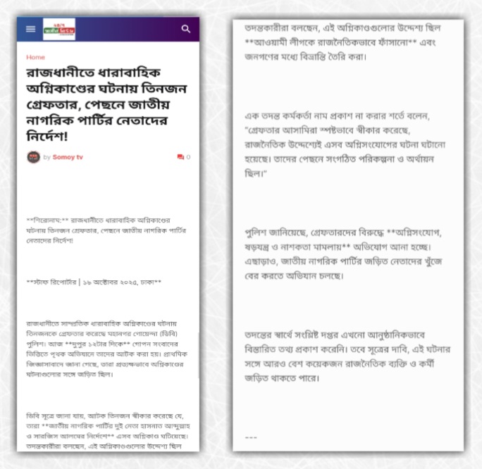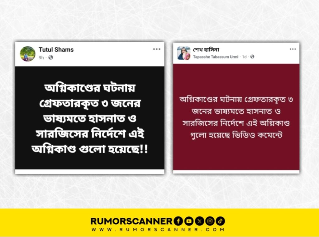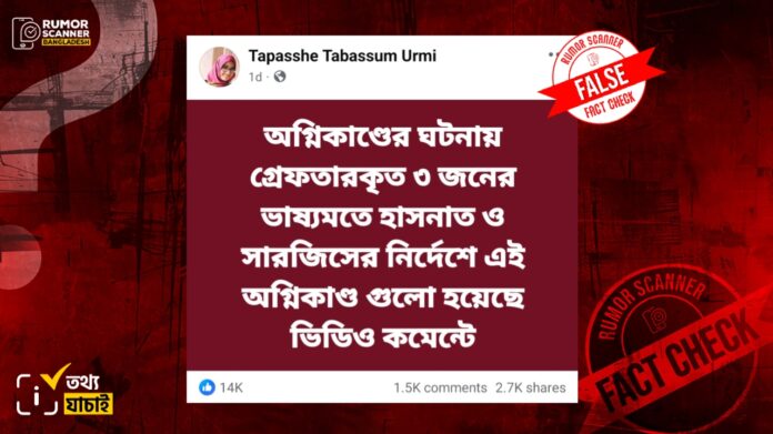 উক্ত লিংকে ‘রাজধানীতে ধারাবাহিক অগ্নিকাণ্ডের ঘটনায় তিনজন গ্রেফতার, পেছনে জাতীয় নাগরিক পার্টির নেতাদের নির্দেশ!’ শিরোনামে প্রকাশিত একটি প্রতিবেদন খুঁজে পাওয়া যায়।