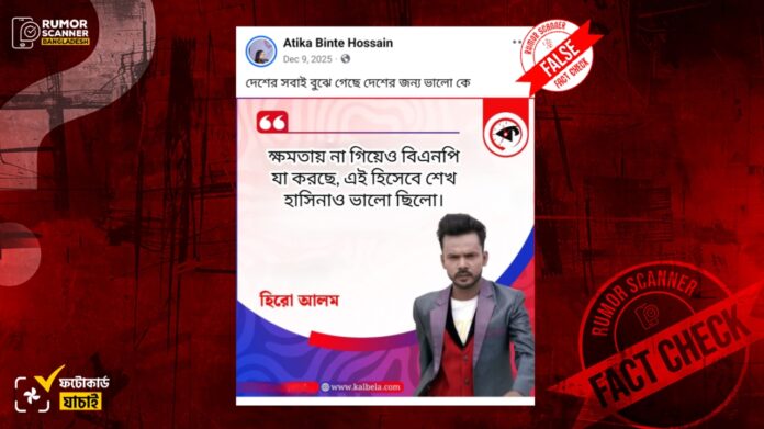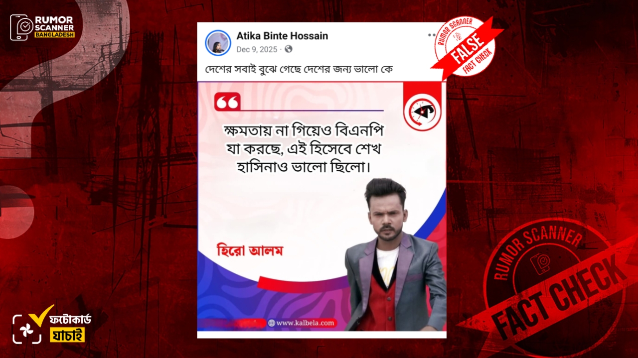 রিউমর স্ক্যানার টিমের অনুসন্ধানে জানা যায়, রাজনৈতিক দল বিএনপি ও সাবেক প্রধানমন্ত্রী শেখ হাসিনাকে জড়িয়ে হিরো আলমকে উদ্ধৃতি করে কালবেলা এরূপ কোনো ফটোকার্ড বা সংবাদ প্রকাশ করেনি এবং হিরো আলমও এমন কোনো মন্তব্য করেননি। বরং, ডিজিটাল প্রযুক্তির সহায়তায় কালবেলার প্রচলিত ফটোকার্ডের আদলে আলোচিত ফটোকার্ডটি তৈরি করা হয়েছে।