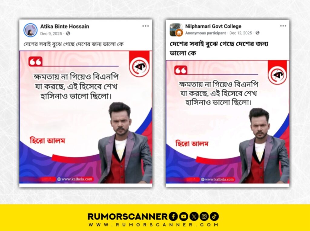 গত বছরের ডিসেম্বরে ‘ক্ষমতায় না গিয়েও বিএনপি যা করছে, এই হিসেবে শেখ হাসিনাও ভালো ছিলো। হিরো আলম’ শিরোনামে আলোচিত কনটেন্ট ক্রিয়েটর আশরাফুল হোসেন ওরফে হিরো আলমকে উদ্ধৃত করে ও তার ছবি যুক্ত করে গণমাধ্যম কালবেলার ডিজাইন সংবলিত একটি ফটোকার্ড সামাজিক যোগাযোগ মাধ্যমে প্রচার করা হয়েছে।