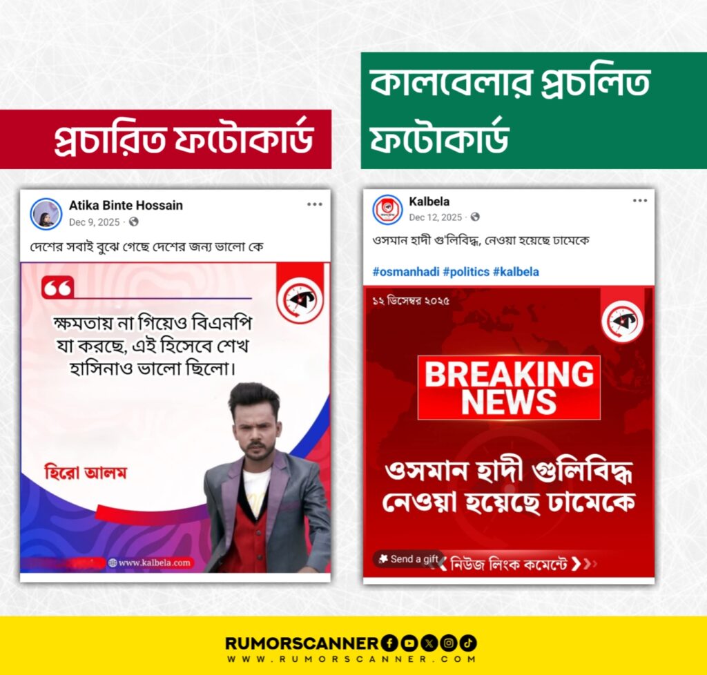 উক্ত সূত্র ধরে কালবেলার ফেসবুক পেজে প্রচারিত ফটোকার্ডগুলো পর্যবেক্ষণ করে উক্ত তারিখে আলোচিত শিরোনাম সংবলিত কোনো ফটোকার্ড খুঁজে পাওয়া যায়নি। এছাড়া, কালবেলার ওয়েবসাইট ও ইউটিউব চ্যানেলেও উক্ত দাবির বিষয়ে কোনো সংবাদ খুঁজে পাওয়া যায়নি। তাছাড়া, কালবেলার প্রচলিত ফটোকার্ডের ডিজাইন ও শিরোনামের ফন্টের সাথে আলোচিত ফটোকার্ডটির পার্থক্যও লক্ষ্য করা যায়।