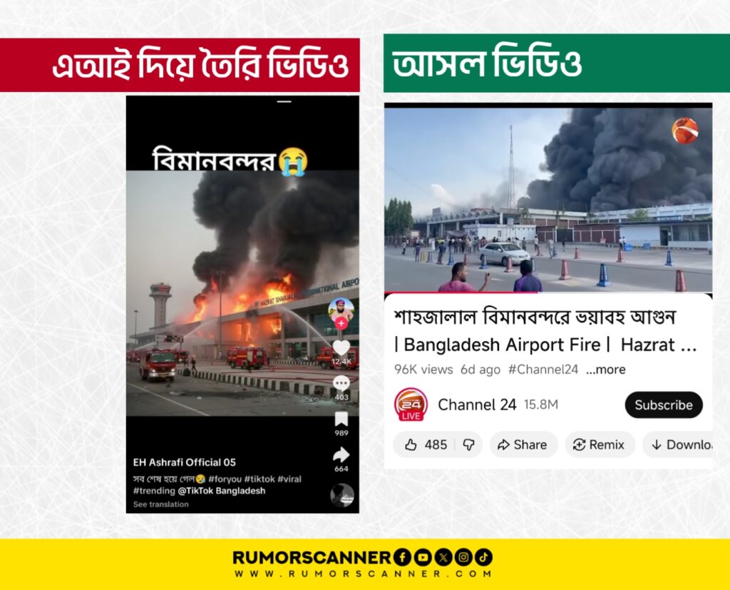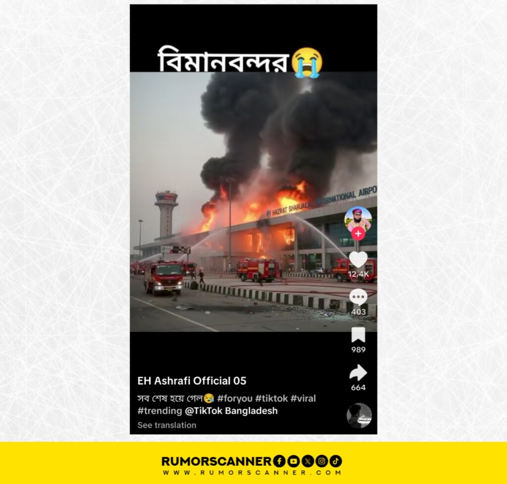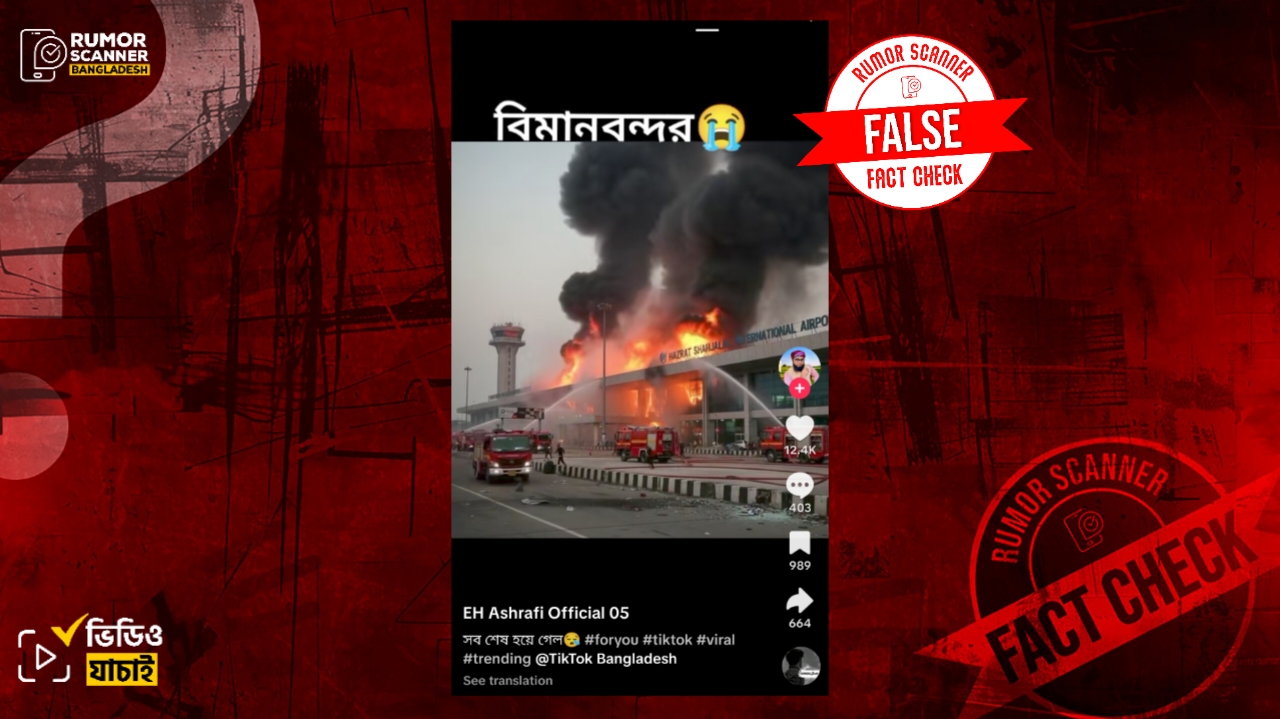 রিউমর স্ক্যানার টিমের অনুসন্ধানে দেখা যায়, ঢাকায় হযরত শাহজালাল আন্তর্জাতিক বিমানবন্দরে অগ্নিকাণ্ডের ঘটনায় আগুন নেভানোর দৃশ্য দাবিতে প্রচারিত ভিডিওটি আসল নয়। প্রকৃতপক্ষে, কৃত্রিম বুদ্ধিমত্তা বা এআই প্রযুক্তি ব্যবহার করে ভুয়া এই ভিডিও তৈরি করা হয়েছে।