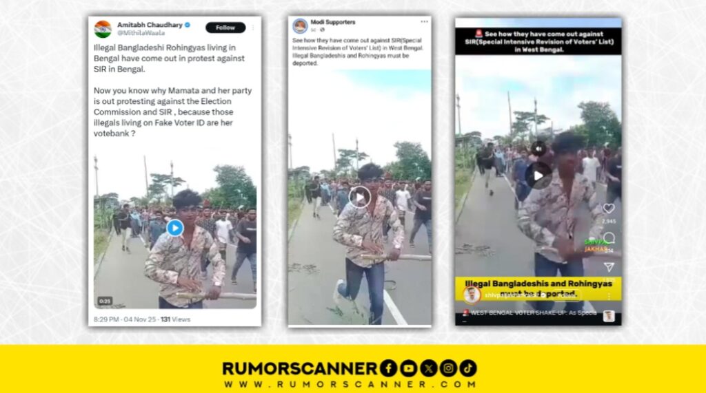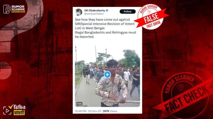 ভারতের নির্বাচন কমিশনের ঘোষণা অনুযায়ী দেশটির ১২টি রাজ্যে ও কেন্দ্রশাসিত অঞ্চলগুলোতে গত ২৮ অক্টোবর থেকে শুরু হয় ভোটার তালিকায় ‘নিবিড় সংশোধনের’ প্রক্রিয়া। যা এসআইআর বা স্পেশাল ইনটেন্সিভ রিভিশন নামে অধিক পরিচিত। এরই অংশ হিসেবে গত ৪ নভেম্বর থেকে পশ্চিমবঙ্গেও শুরু হয় ভোটার তালিকায় নিবিড় সংশোধন কর্মসূচি। জানা যায়, এই প্রক্রিয়ায় প্রয়োজনীয় নথি না দেখাতে পারলে বহু মানুষের নাম ভোটার তালিকা থেকে বাদ যাওয়ার আশঙ্কা রয়েছে। ক্ষমতাসীন বিজেপির কেন্দ্রীয় নেতারা দাবি করে আসছেন, পশ্চিমবঙ্গের মতো কিছু রাজ্যে বহু কথিত বাংলাদেশি অনুপ্রবেশকারী ভোটার তালিকায় নাম তুলে ফেলেছেন। ‘নিবিড় সংশোধন’ হলেই বাদ পড়বে ‘অবৈধ বাংলাদেশি’ ও ‘রোহিঙ্গারা’। এর প্রেক্ষিতে সম্প্রতি ‘See how they have come out against SIR(Special Intensive Revision of Voters’ List) in West Bengal. Illegal Bangladeshis and Rohingyas must be deported.’ ক্যাপশনে একটি ভিডিও ইন্টারনেটে বিভিন্ন প্লাটফর্মে প্রচার করা হয়েছে।