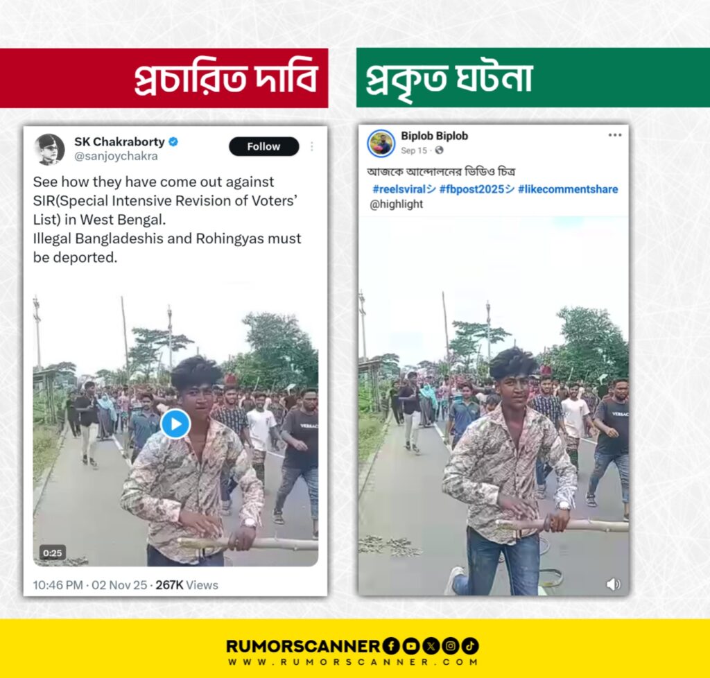 প্রচারিত ভিডিওটির ক্যাপশনে দাবি করা হয়, ভারতের বিধানসভা নির্বাচনের আগে ভোটার তালিকার বিশেষ ও নিবিড় সংশোধন বা SIR (Special Intensive Revision) প্রক্রিয়া শুরুর পর থেকে ভারতে থাকা অবৈধ বাংলাদেশি এবং রোহিঙ্গা অভিবাসীরা পশ্চিমবঙ্গে SIR-এর বিরুদ্ধে বিক্ষোভ করছে।
