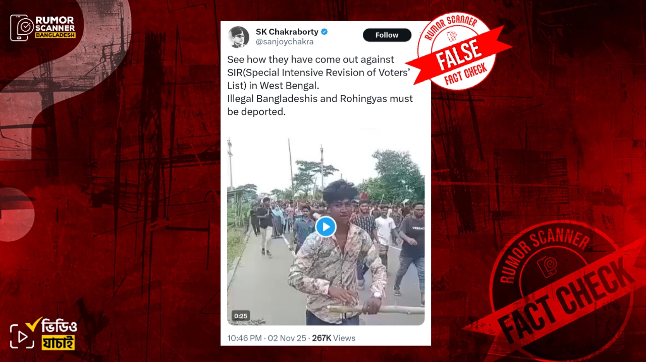 রিউমর স্ক্যানার টিমের অনুসন্ধানে জানা যায়, প্রচারিত ভিডিওটি ভারতে থাকা অবৈধ বাংলাদেশি এবং রোহিঙ্গা অভিবাসীদের ভারতের ভোটার তালিকা সংশোধন প্রক্রিয়ার বিরুদ্ধে পশ্চিমবঙ্গে বিক্ষোভের দৃশ্য নয়। প্রকৃতপক্ষে, বাংলাদেশের ফরিদপুর জেলার ভাঙ্গা উপজেলার নির্বাচনী সীমানা পুনর্বিন্যাসের প্রতিবাদে স্থানীয় বাসিন্দাদের বিক্ষোভের ভিডিওকে উক্ত দাবিতে প্রচার করা হয়েছে।