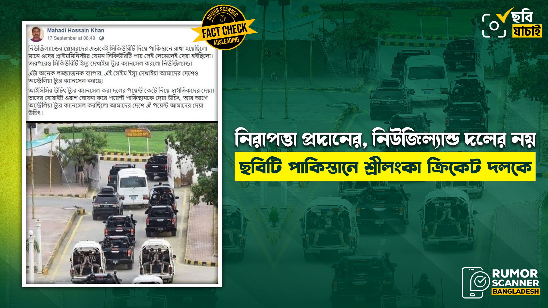 অর্থাৎ, ২০১৯ সালে পাকিস্তানে সফররত শ্রীলংকান ক্রিকেট দলকে নিরাপত্তার প্রদানের পুরোনো ছবিটিকে বর্তমানে নিউজিল্যান্ড দলকে নিরাপত্তা প্রদানের চিত্র দাবিতে সামাজিক মাধ্যমে প্রচার করা হচ্ছে যা সম্পূর্ণ বিভ্রান্তিকর।