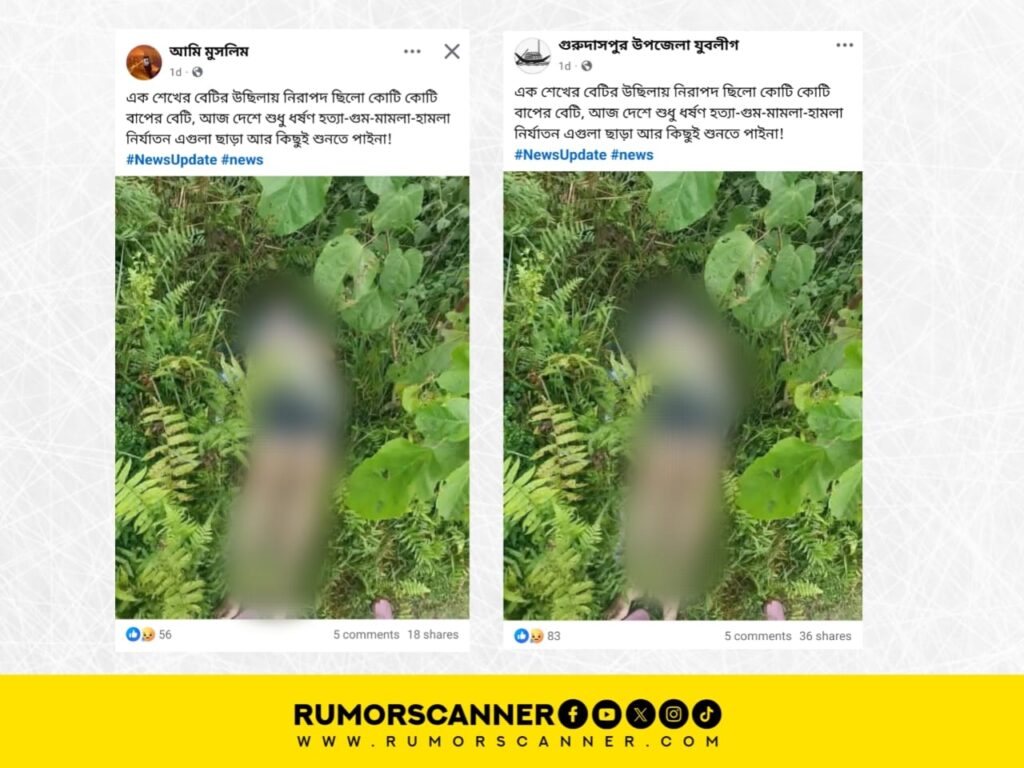 সম্প্রতি, “এক শেখের বেটির উছিলায় নিরাপদ ছিলো কোটি কোটি বাপের বেটি, আজ দেশে শুধু ধর্ষণ হত্যা-গুম-মামলা-হামলা নির্যাতন এগুলা ছাড়া আর কিছুই শুনতে পাইনা” শীর্ষক শিরোনামে একটি ছবি সামাজিক যোগাযোগ মাধ্যমে প্রচার করা হয়েছে। ছবিতে এক নারীর মৃতদেহ জঙ্গলে পড়ে থাকতে দেখা যায়।