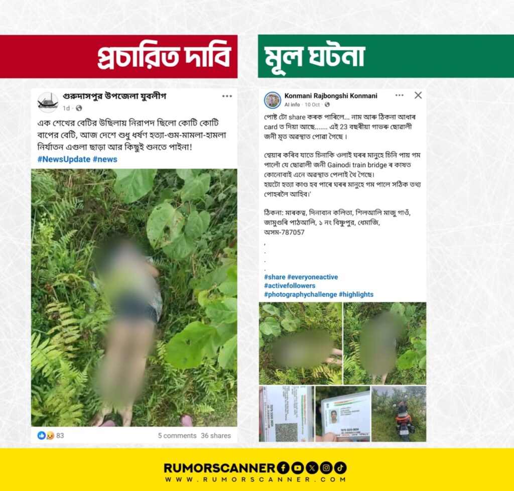 উক্ত পোস্টে দাবি করা হয়, ‘২৩ বছর বয়সী এক তরুণীকে মৃত অবস্থায় পাওয়া গেছে। তার নাম ও ঠিকানা আধার কার্ডে দেওয়া আছে। মেয়েটিকে ধেমাজির গাইনোদি রেল ব্রিজের পাশে অচেতন অবস্থায় ফেলে রাখা হয়েছিল বলে জানা গেছে। সম্ভবত এটি একটি হত্যাকাণ্ড হতে পারে। ঠিকানা: মারকত্ব, দিনাবান কলিতা, শিলআলি মাঝু গাঁও, জামুগুড়ি পাঠআলি, ১ নং বিষ্ণুপুর, ধেমাজি, আসাম – ৭৮৭০৫৭’ (অনূদিত)