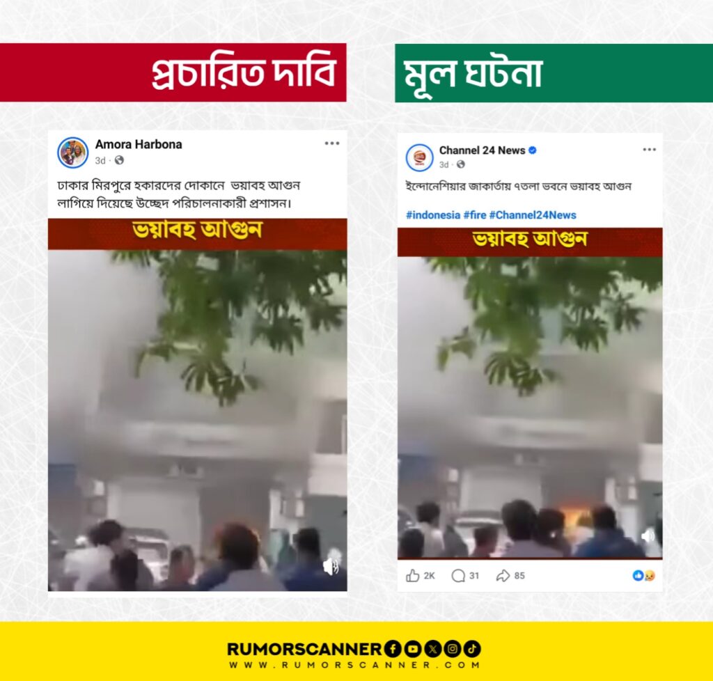 এ বিষয়ে অনুসন্ধানে মূলধারার গণমাধ্যম চ্যানেল২৪–এর অফিসিয়াল ফেসবুক পেজে ৯ ডিসেম্বর প্রকাশিত একটি ভিডিও পাওয়া যায়। উক্ত ভিডিওটির সঙ্গে প্রচারিত ভিডিওর সাদৃশ্য রয়েছে। প্রকাশিত ভিডিওর ক্যাপশন থেকে জানা যায়, এটি ইন্দোনেশিয়ার জাকার্তায় একটি সাততলা ভবনে অগ্নিকাণ্ডের ঘটনার দৃশ্য।
