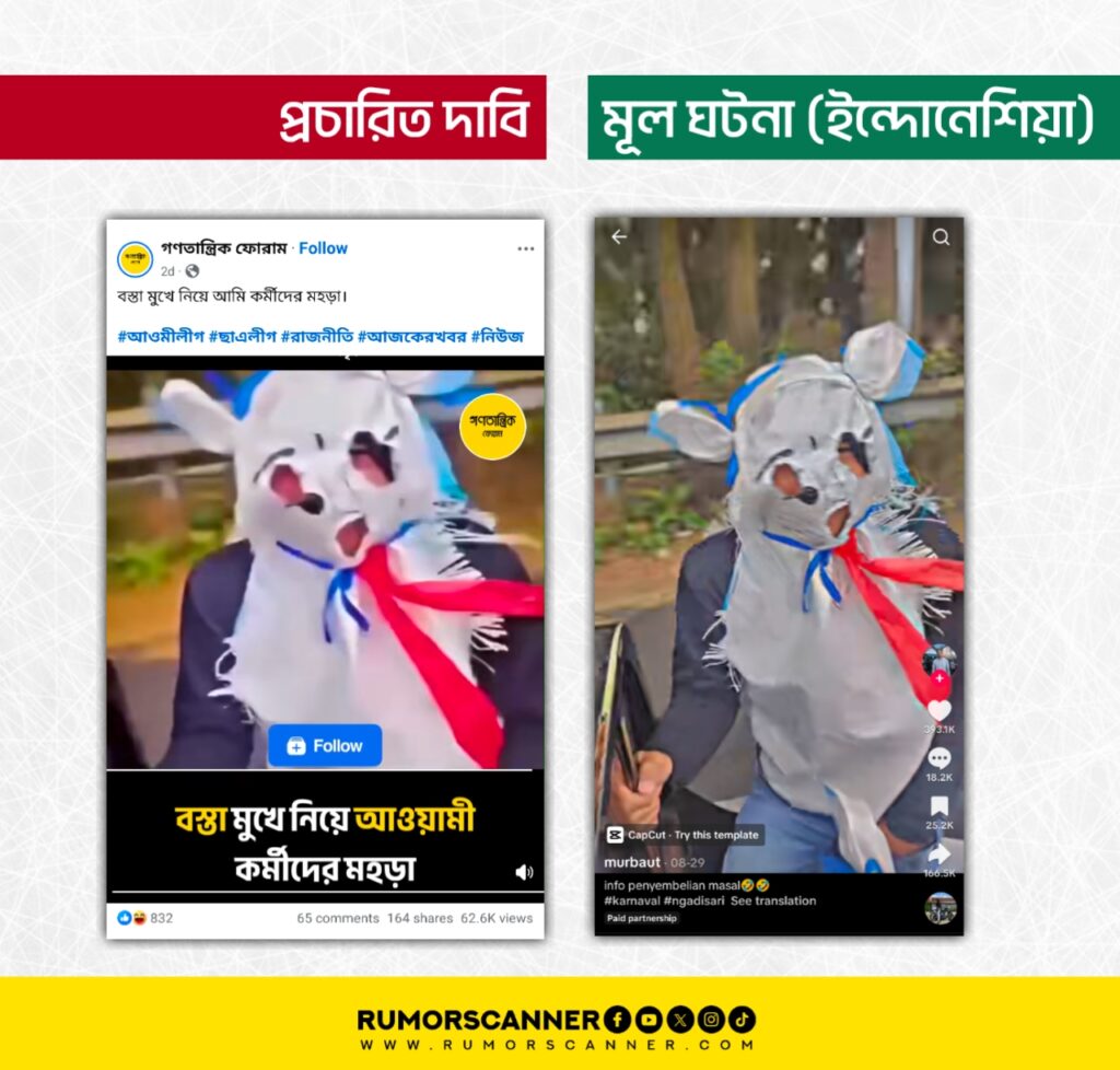 রিউমর স্ক্যানার টিমের অনুসন্ধানে দেখা যায়,মুখে বস্তা বেঁধে স্লোগান দেওয়ার এই ভিডিওটি আওয়ামী লীগ কিংবা ছাত্রলীগের কর্মী-সমর্থকদের নয়। প্রকৃতপক্ষে, এটি ইন্দোনেশিয়ার ৮০তম স্বাধীনতা দিবস উপলক্ষে দেশটির পূর্ব জাভা রাজ্যের নাগাদিসারি গ্রামে আয়োজিত কার্নিভালে একদল যুবকের মুখে বস্তা বেঁধে যাওয়ার ভিডিও।