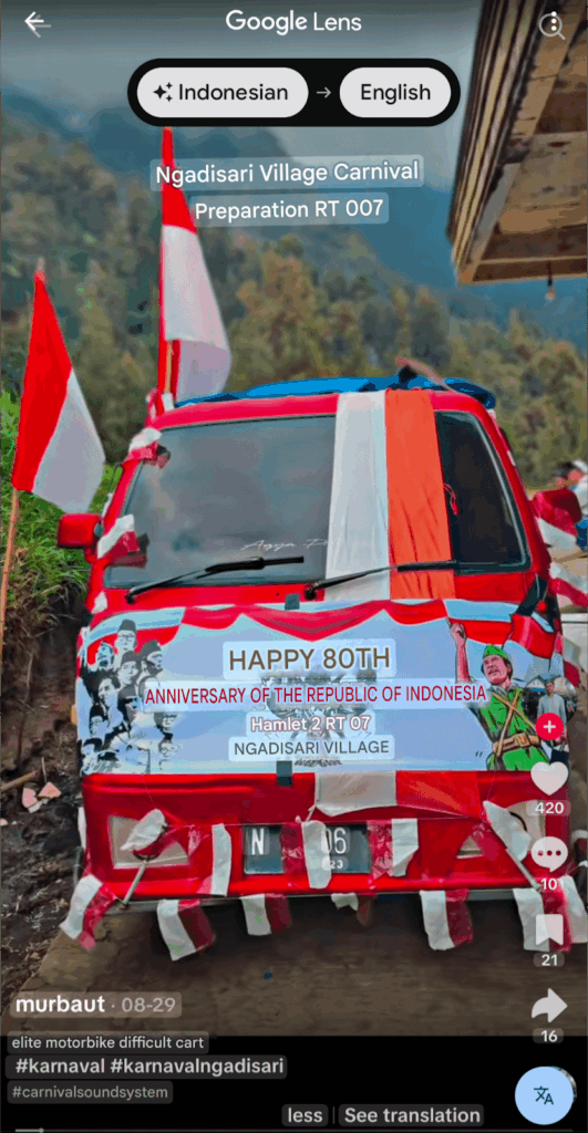 পিকআপটির সামনের লেখা থেকে জানা যায়, ভিডিওতে দেখতে পাওয়া যুবকরা ইন্দোনেশিয়ার ৮০তম স্বাধীনতা দিবস উপলক্ষে দেশটির পূর্ব জাভা রাজ্যের নাগাদিসারি গ্রামে আয়োজিত কার্নিভালে অংশগ্রহণ করতে যাচ্ছেন। অ্যাকাউন্টটিতে তাদের অংশগ্রহণের জন্যে প্রস্তুতি নেওয়ার একটি ভিডিও পাওয়া যায়।