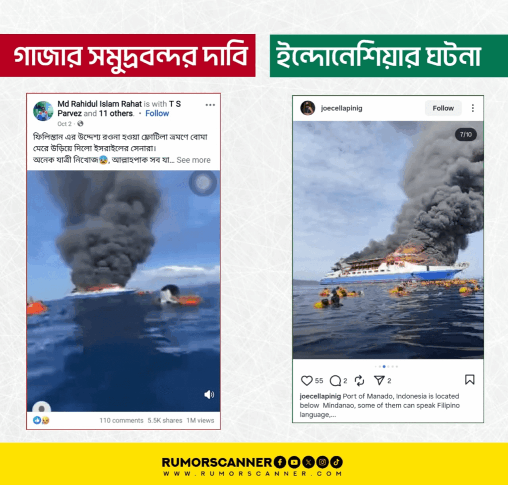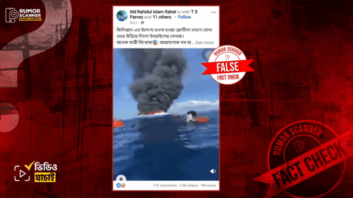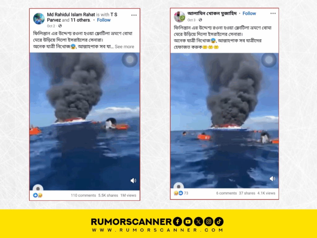 রিউমর স্ক্যানার টিমের অনুসন্ধানে জানা যায়, প্রচারিত ভিডিওটি গ্লোবাল সুমুদ ফ্লোটিলার নয় বরং, এটি ইন্দোনেশিয়ার মানাদো বন্দরে একটি যাত্রীবাহী জাহাজে অগ্নিকাণ্ডের ঘটনার ভিডিও।