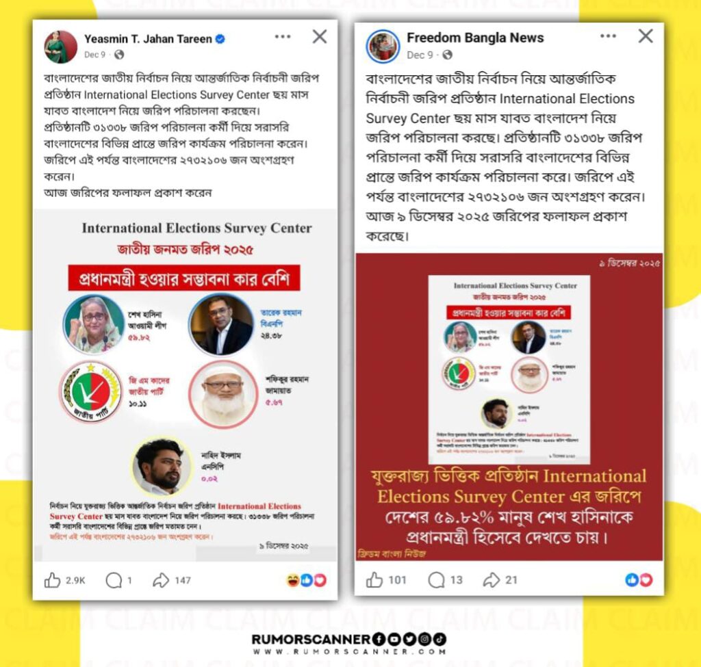 সম্প্রতি অনলাইনে কথিত একটি জরিপের ছবি প্রচার করে দাবি করা হয়েছে, ‘বাংলাদেশের জাতীয় নির্বাচন নিয়ে যুক্তরাজ্য ভিত্তিক আন্তর্জাতিক নির্বাচনী জরিপ প্রতিষ্ঠান International Elections Survey Center ছয় মাস যাবত বাংলাদেশ নিয়ে জরিপ পরিচালনা করছেন। প্রতিষ্ঠানটি ৩১৩৩৮ জরিপ পরিচালনা কর্মী দিয়ে সরাসরি বাংলাদেশের বিভিন্ন প্রান্তে জরিপ কার্যক্রম পরিচালনা করেন। জরিপে এই পর্যন্ত বাংলাদেশের ২৭৩২১০৬ জন অংশগ্রহণ করেন। উক্ত জরিপে প্রধানমন্ত্রী হওয়ার সম্ভাবনা কার বেশি এমন প্রশ্নের জবাবে আওয়ামী লীগের শেখ হাসিনার নাম বলেন ৫৯.৮২ শতাংশ, বিএনপির তারেক রহমানের নাম বলেন ২৪.৩৮ শতাংশ, জাতীয় পার্টির জিএম কাদেরের নাম বলেন ১০.১১ শতাংশ, জামায়াতের শফিকুর রহমানের নাম বলেন ৫.৬৭ শতাংশ, এনসিপির নাহিদ ইসলামের নাম বলেন ০.০২ শতাংশ।’