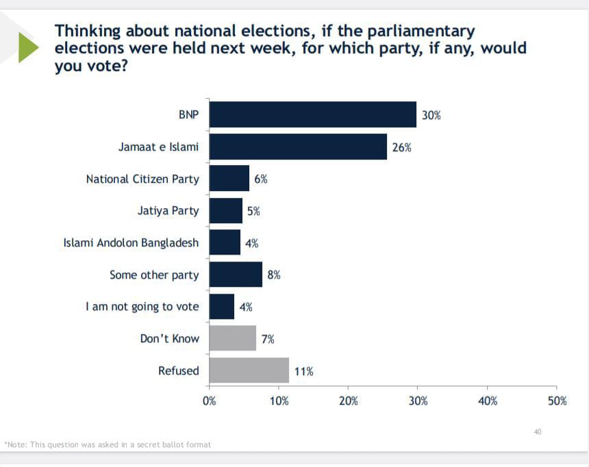 এছাড়াও আইআরআই এর জরিপটিতে “জাতীয় নির্বাচনের কথা চিন্তা করলে, আগামী সপ্তাহে যদি সংসদীয় নির্বাচন অনুষ্ঠিত হয়, তবে আপনি কোন দলকে ভোট দেবেন?’ এমন প্রশ্নের জবাবে ৩০ শতাংশ বিএনপি, ২৬ শতাংশ বাংলাদেশ জামায়াতে ইসলামী, ৬ শতাংশ জাতীয় নাগরিক পার্টি, ৫ শতাংশ জাতীয় পার্টি, ৩ শতাংশ ইসলামী আন্দোলন বাংলাদেশ এবং ৮ শতাংশ এর বাইরে অন্য কোনো দলের নাম বলেন। একইরকম তথ্য আগামী সংসদ নির্বাচনে ভোট দেওয়ার প্রবল সম্ভাবনা থাকা ৩২৭০ জন ভোটারের উত্তরেও দেখা যায়। এছাড়াও, জরিপে ৬৯ শতাংশ মানুষ আওয়ামী লীগের নিবন্ধন স্থগিত করার সিদ্ধান্তকে সমর্থন জানান।