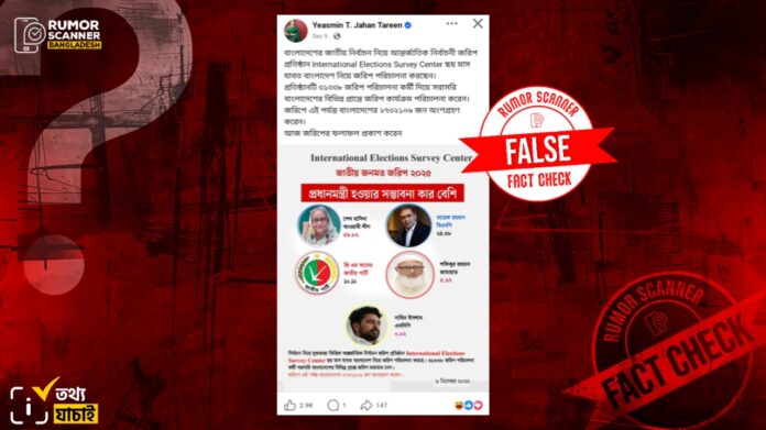রিউমর স্ক্যানার টিমের অনুসন্ধানে জানা যায়, ‘International Elections Survey Center’ নামে এমন কোনো জরিপ প্রতিষ্ঠান নেই যারা সাম্প্রতিক সময়ে আলোচিত দাবির অনুরূপ কোনো জরিপ প্রকাশ করেছে। তাছাড়া, সাম্প্রতিক সময়ে বাংলাদেশের নির্বাচনের সরকার গঠন নিয়ে প্রকাশিত নানা জরিপে কার্যক্রম নিষিদ্ধ আওয়ামী লীগ নয় বরং, বিএনপির পক্ষে তুলনামূলক সবচেয়ে বেশি মানুষের মতামত দেখা যায়।