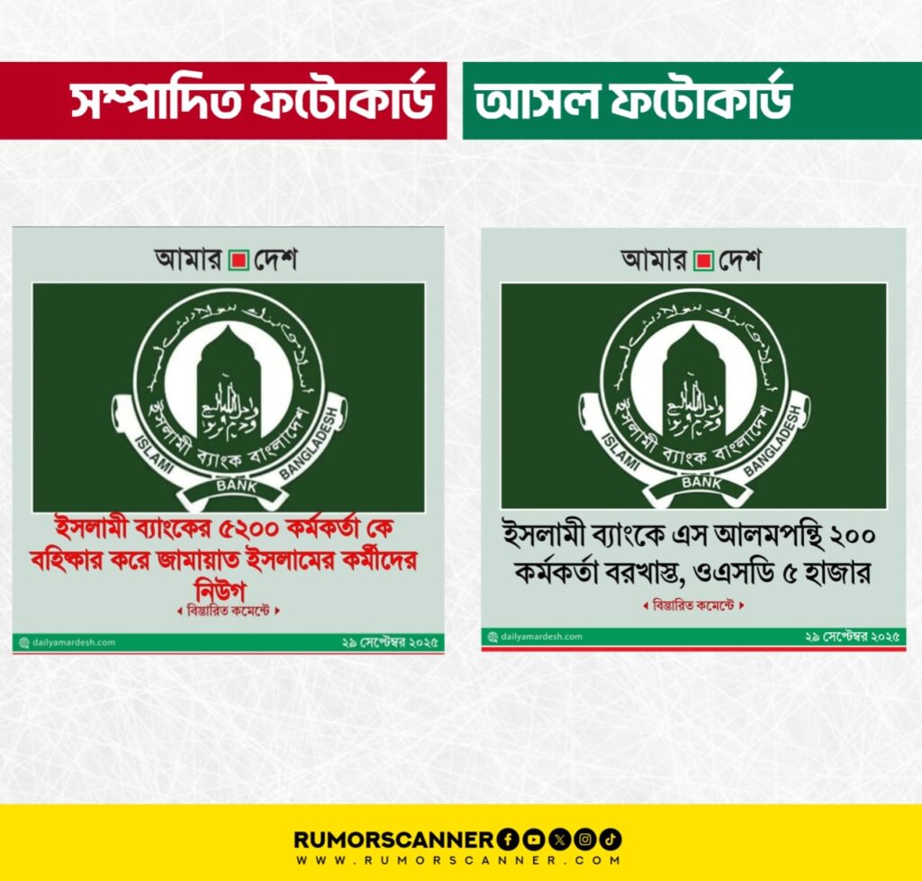 রিউমর স্ক্যানার টিমের অনুসন্ধানে জানা যায়, ‘ইসলামী ব্যাংকের ৫২০০ কর্মকর্তা কে বহিষ্কার করে জামায়াত ইসলামের কর্মীদের নিউগ’ শিরোনামে আমার দেশ কোনো ফটোকার্ড বা সংবাদ প্রকাশ করেনি। প্রকৃতপক্ষে, ডিজিটাল প্রযুক্তির সহায়তায় সম্পাদনার মাধ্যমে গণমাধ্যমটির ডিজাইন নকল করে ফটোকার্ডটি প্রচার করা হয়েছে।