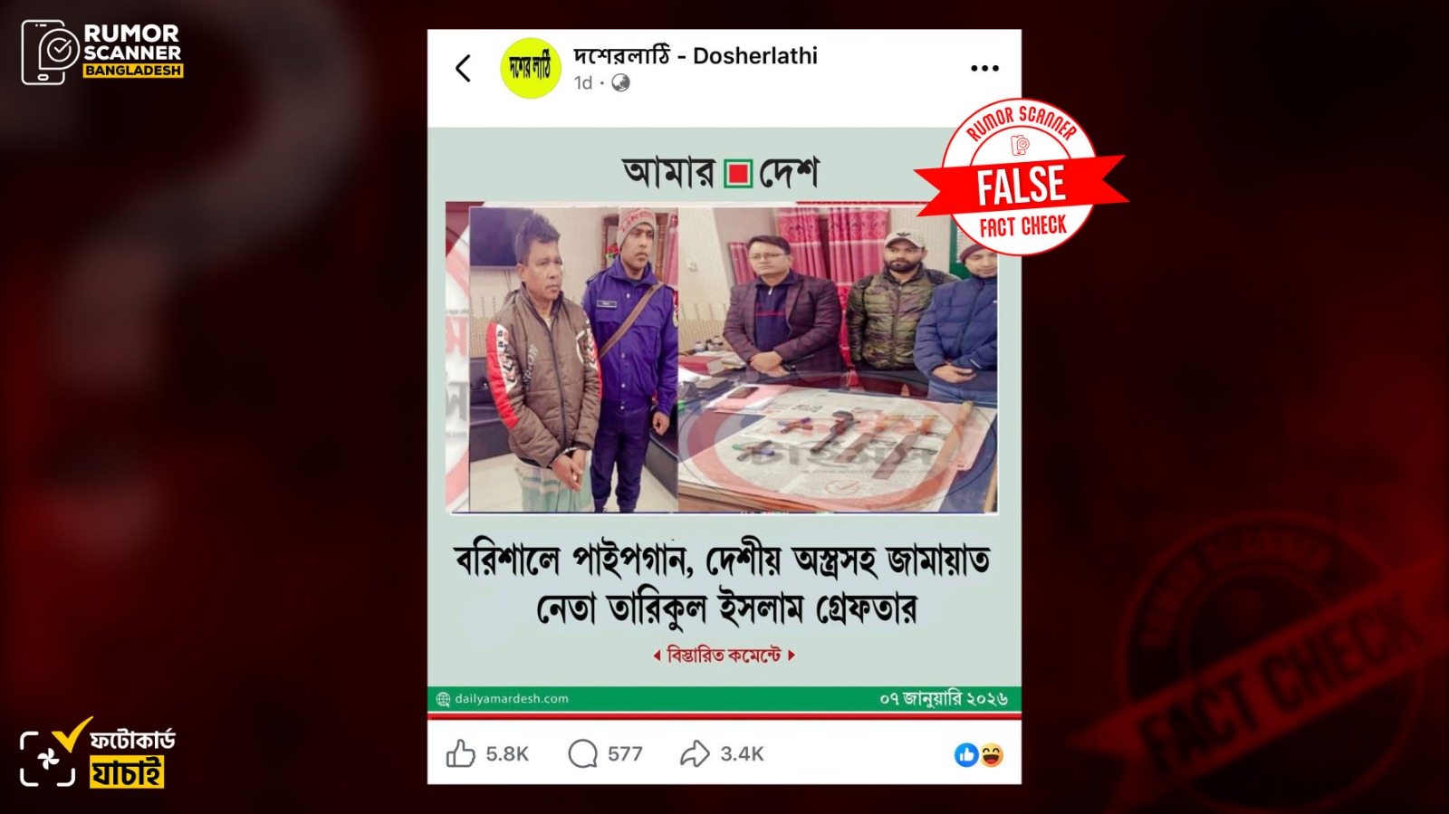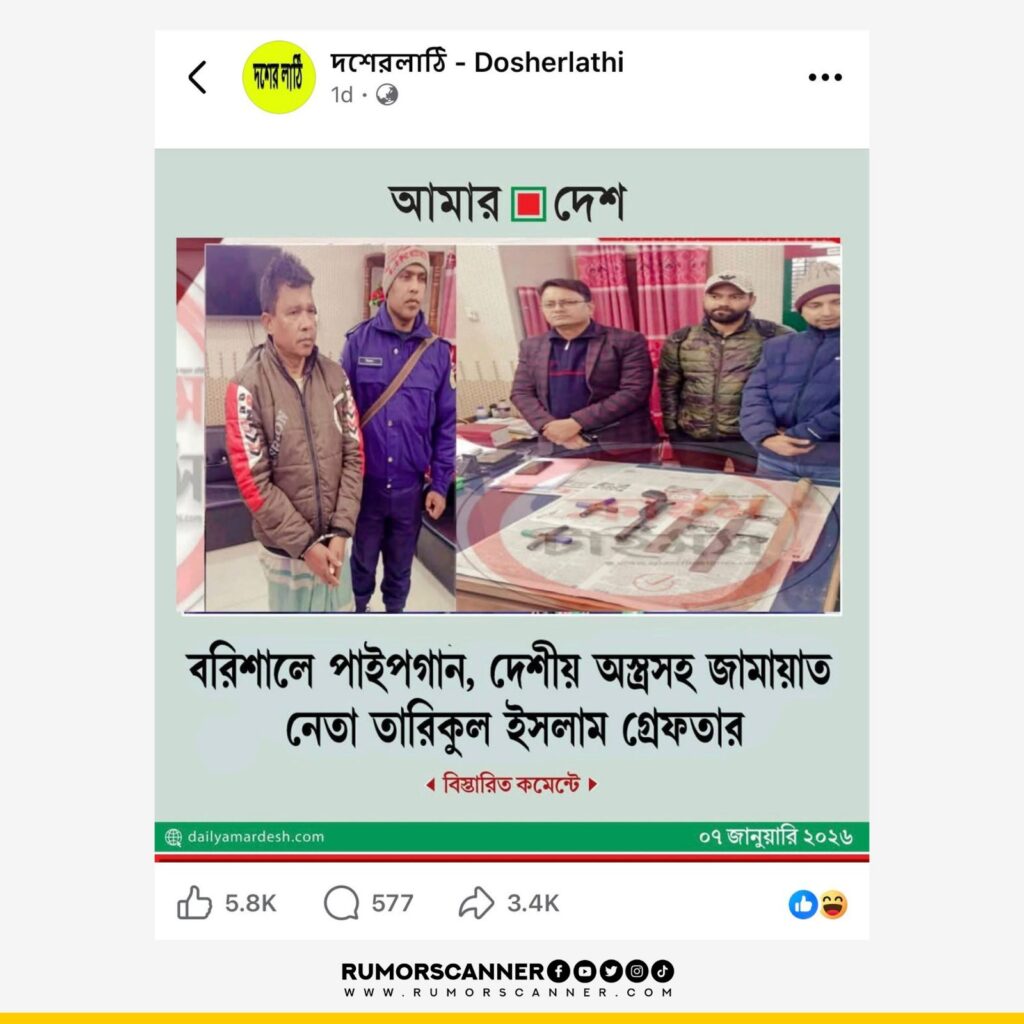 সম্প্রতি ‘বরিশালে পাইপগান, দেশীয় অস্ত্রসহ জামায়াত নেতা তারিকুল ইসলাম গ্রেফতার’ শিরোনামে জাতীয় দৈনিক আমার দেশের ডিজাইন সংবলিত একটি ফটোকার্ড সামাজিক যোগাযোগ মাধ্যমে প্রচার করা হয়েছে।