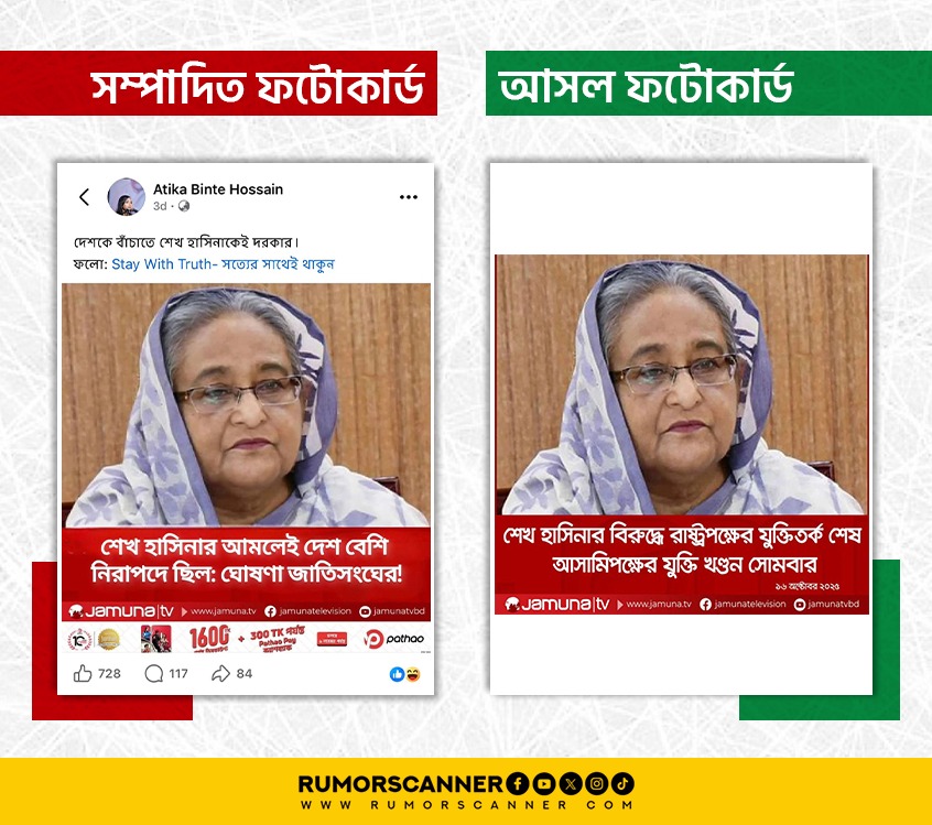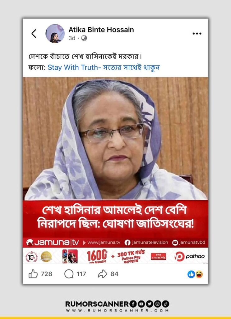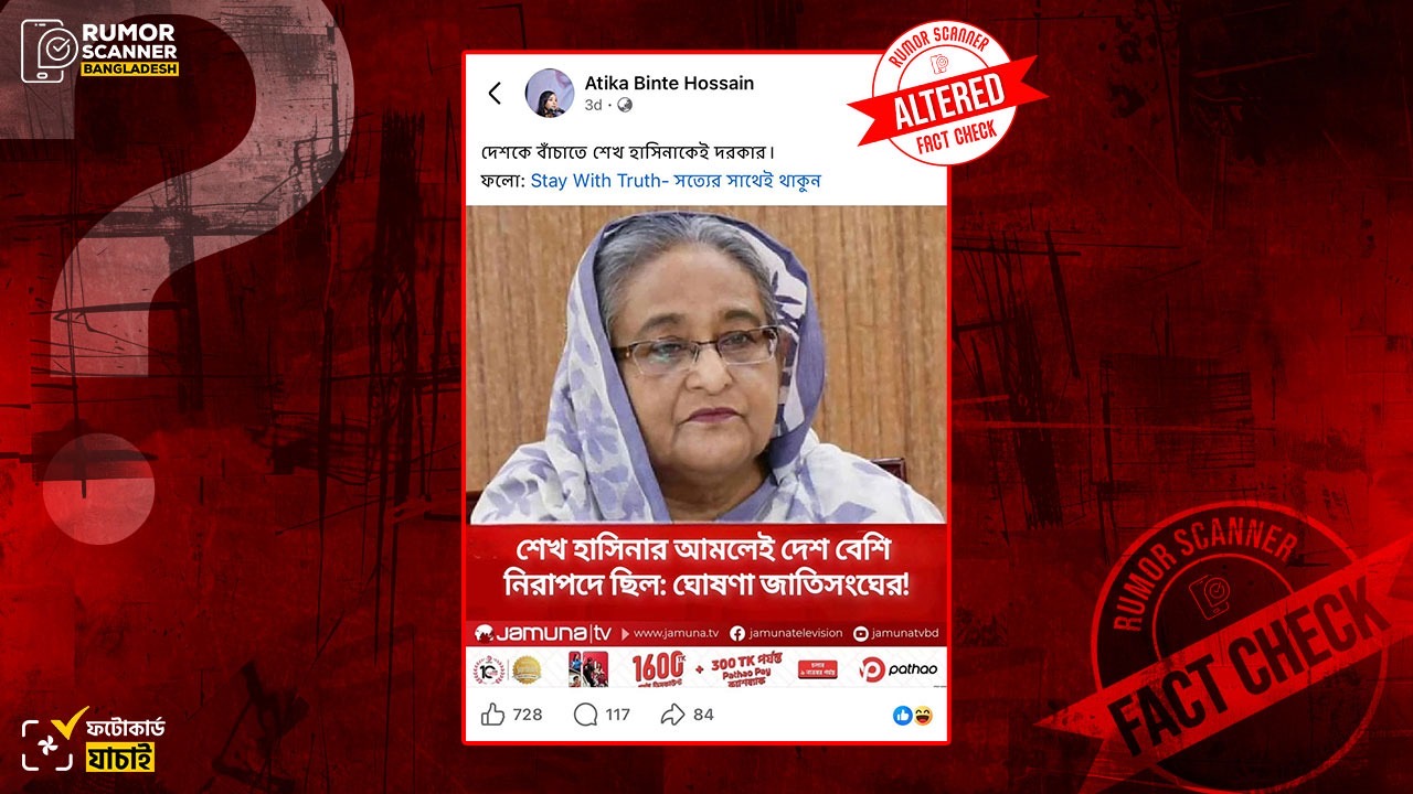 সম্প্রতি জুলাই গণ-অভ্যুত্থানের সময় সংঘটিত মানবতাবিরোধী অপরাধের দায়ে দন্ডিত ক্ষমতাচ্যুত প্রধানমন্ত্রী শেখ হাসিনাকে উদ্ধৃত করে ‘শেখ হাসিনার আমলেই দেশ বেশি নিরাপদে ছিল: ঘোষণা জাতিসংঘের!’ শিরোনামে মূলধারার গণমাধ্যম যমুনা টিভির ডিজাইন সংবলিত একটি ফটোকার্ড প্রচার করা হয়েছে।