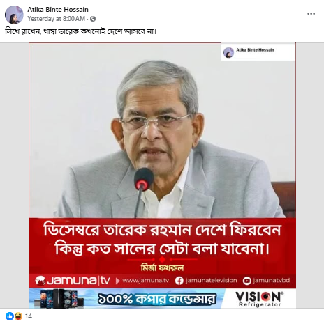 সম্প্রতি, বিএনপির মহাসচিব মির্জা ফখরুল ইসলাম আলমগীর ‘ডিসেম্বরে তারেক রহমান দেশে ফিরবেন কিন্তু কত সালের সেটা বলা যাবে ন’ শীর্ষক মন্তব্যটি করেছেন দাবিতে যমুনা টেলিভিশনের ডিজাইন সংবলিত একটি ফটোকার্ড সামাজিক যোগাযোগ মাধ্যম ফেসবুকে প্রচার করা হয়েছে।