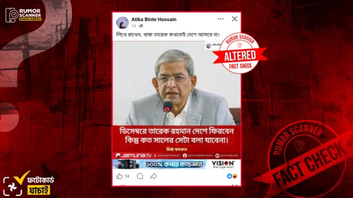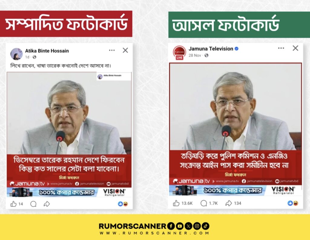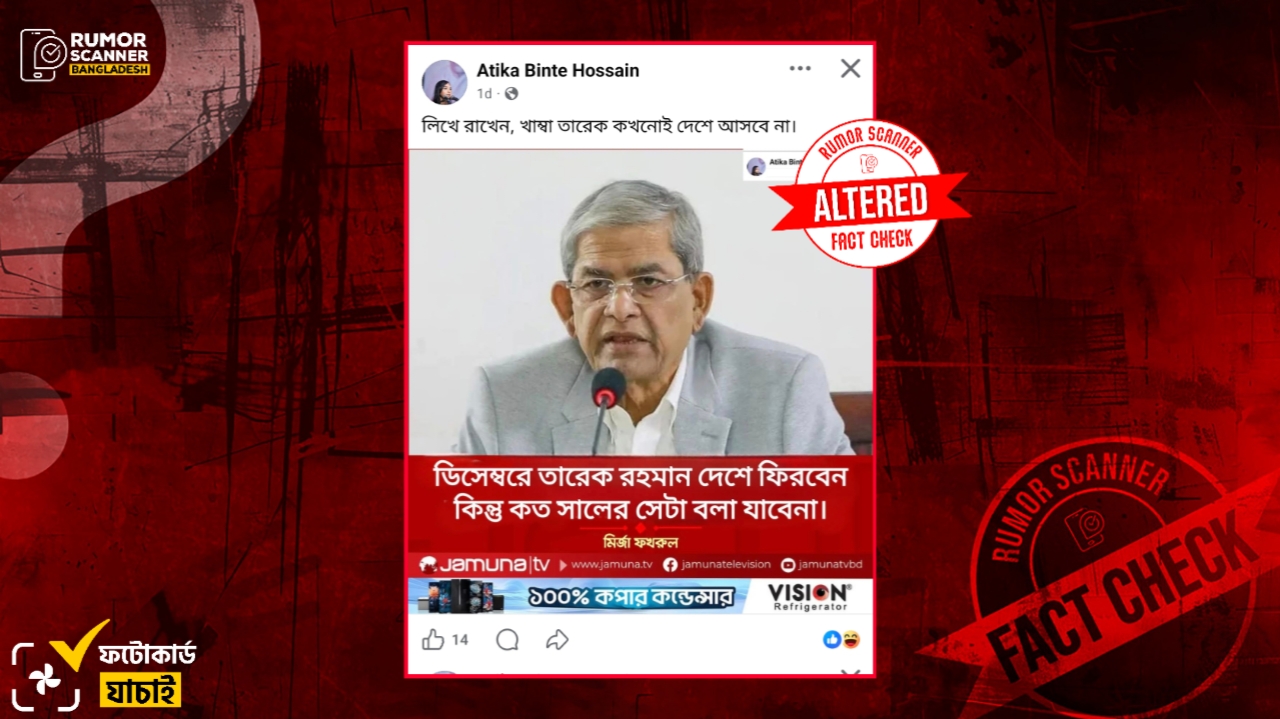 রিউমর স্ক্যানার টিমের অনুসন্ধানে দেখা যায়, মির্জা ফখরুল ইসলাম আলমগীর তারেক রহমানের দেশে আসা প্রসঙ্গে আলোচিত মন্তব্যটি করেননি এবং উক্ত শিরোনামে যমুনা টিভিও কোনো ফটোকার্ড প্রকাশ করেনি। প্রকৃতপক্ষে, মির্জা ফখরুলের ভিন্ন মন্তব্য সংবলিত যমুনা টিভির একটি ফটোকার্ড ডিজিটাল প্রযুক্তির সহায়তার সম্পাদনার মাধ্যমে আলোচিত ফটোকার্ডটি তৈরি করা হয়েছে।