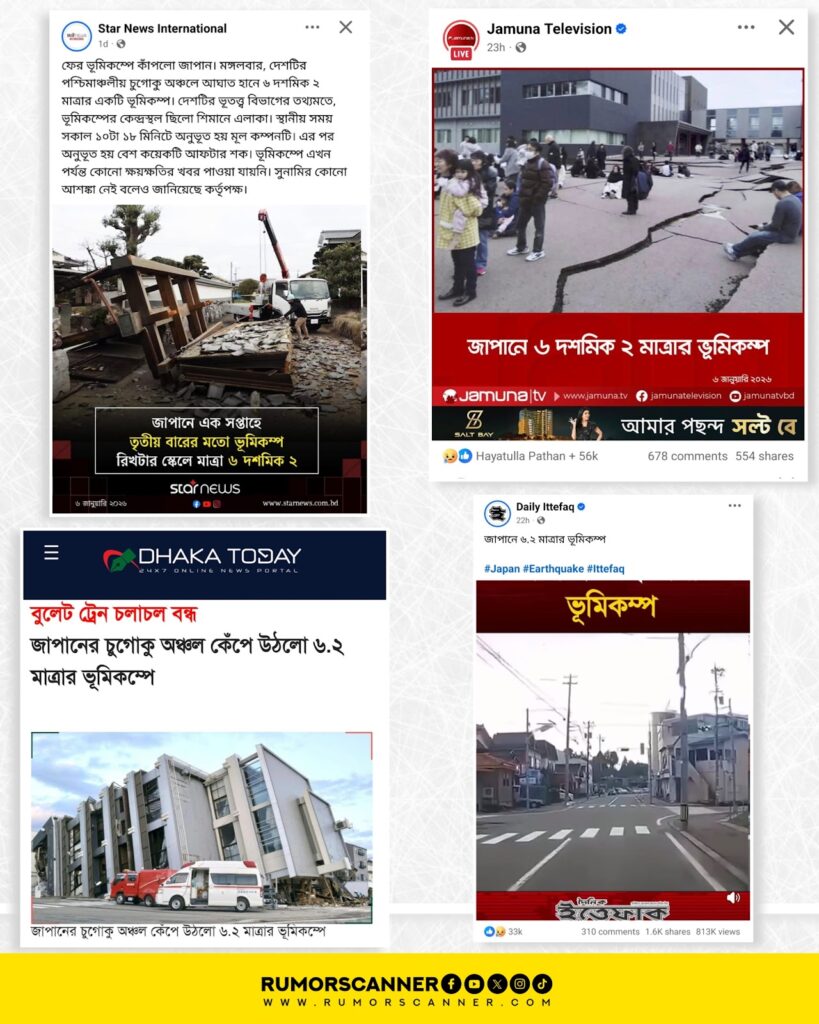 সুতরাং, গত ০৬ জানুয়ারির জাপানের ভূমিকম্পের দৃশ্য দাবিতে দেশের গণমাধ্যমে তিনটি পুরোনো ছবি ও একটি ভিডিও প্রচার করা হয়েছে, যা বিভ্রান্তিকর।