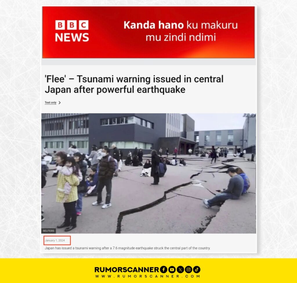 একটি ফাটল ধরা রাস্তার ছবি জাপানের গত ০৬ জানুয়ারির গত ০৬ জানুয়ারির ভূমিকম্প সংক্রান্ত প্রতিবেদনে ব্যবহার করা হয়। ছবিটির বিষয়ে অনুসন্ধানে স্টক ফটো ওয়েবসাইট অ্যালামিতে একই ছবির সন্ধান পাওয়া যায়। অ্যালামির তথ্য অনুযায়ী, ছবিটি ২০২৪ সালের ১ জানুয়ারি জাপানি সাগরের উপকূলীয় বিস্তীর্ণ এলাকায় আঘাত হানা রিখটার স্কেলে ৭.৬ মাত্রার শক্তিশালী ভূমিকম্পে সৃষ্ট ধ্বংসযজ্ঞের। একই ছবি ও তথ্য বিবিসি ও ফক্স নিউজের প্রতিবেদনেও পাওয়া যায়।