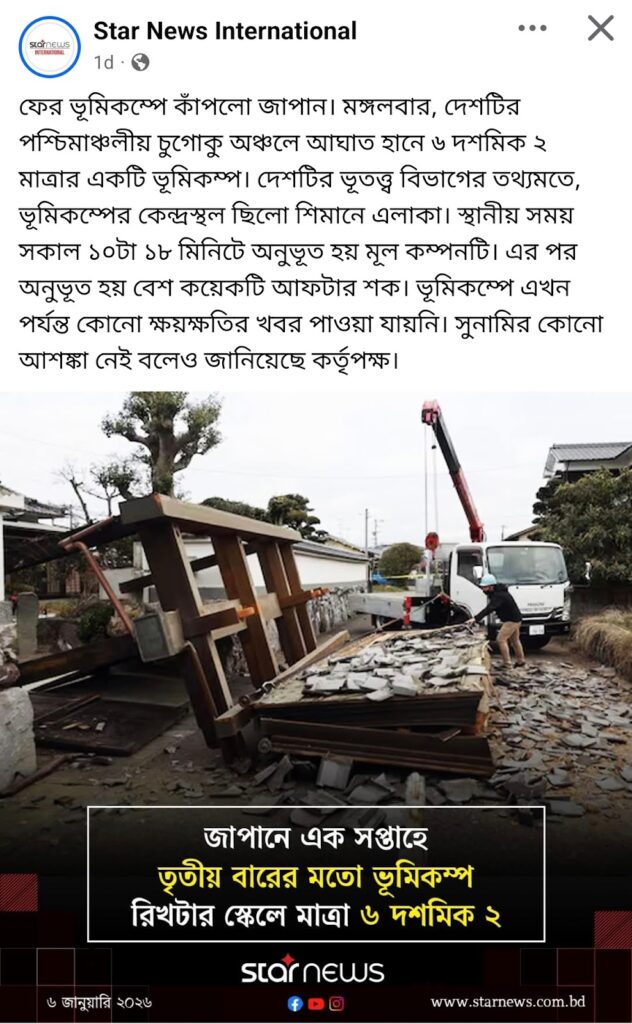 গত ৬ জানুয়ারি ভোরে জাপানের পশ্চিমাঞ্চলের চুগোকু অঞ্চলে ৬.২ মাত্রার একটি শক্তিশালী ভূমিকম্প আঘাত হেনেছে। এ ভূমিকম্পের দৃশ্য দাবিতে দেশের বিভিন্ন গণমাধ্যমে অন্তত তিনটি ছবি ও একটি ভিডিও প্রচারিত হতে দেখা যায়