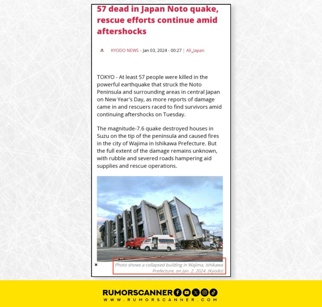 হেলে পড়া একটি ভবনের ছবি গত ০৬ জানুয়ারির ভূমিকম্প সংক্রান্ত প্রতিবেদনে ব্যবহার করা হয়। তবে অনুসন্ধানে টোকিওভিত্তিক সংবাদ সংস্থা কিয়োদো নিউজের ওয়েবসাইটে ২০২৪ সালে প্রকাশিত একটি প্রতিবেদনে একই ছবির সন্ধান পাওয়া যায়। ওই প্রতিবেদনের বিবরণ অনুযায়ী, ছবিটি ২০২৪ সালের ০২ জানুয়ারি জাপানের ইশিকাওয়া প্রিফেকচারের ওয়াজিমা শহরে ভূমিকম্পে ক্ষতিগ্রস্ত হয়ে হেলে পড়া একটি ভবনের দৃশ্য।