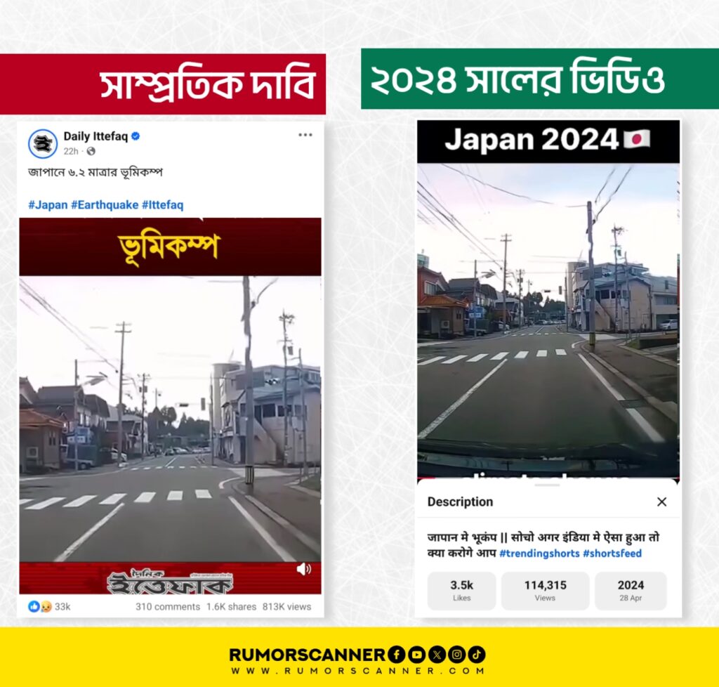 ভূমিকম্পের সময় একটি গাড়ি থেকে সড়কের দৃশ্য ধারণ করা একটি ভিডিও গত ০৬ জানুয়ারির জাপানের ভূমিকম্পের মুহূর্ত বলে দাবি করা হয়। তবে, যাচাই করে ২০২৪ সালের এপ্রিল মাসে একটি ইউটিউব চ্যানেলে একই ভিডিওর সন্ধান পাওয়া যায়, যেখানে এটিকে জাপানের ভূমিকম্পের দৃশ্য হিসেবে উল্লেখ করা হয়েছে।