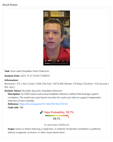 বিষয়টি আরও নিশ্চিত হতে কৃত্রিম বুদ্ধিমত্তার সহায়তায় তৈরি কনটেন্ট শনাক্তকারী টুল ‘ডিপফেক-ও-মিটার’ এর ‘AVSRDD (2025)’ মডেলের মাধ্যমে ভিডিওটি পরীক্ষা করে রিউমর স্ক্যানার। মডেলটির বিশ্লেষণে দেখা যায়, ভিডিওটি এআই দিয়ে তৈরি হওয়ার সম্ভাবনা প্রায় ১০০ শতাংশ।