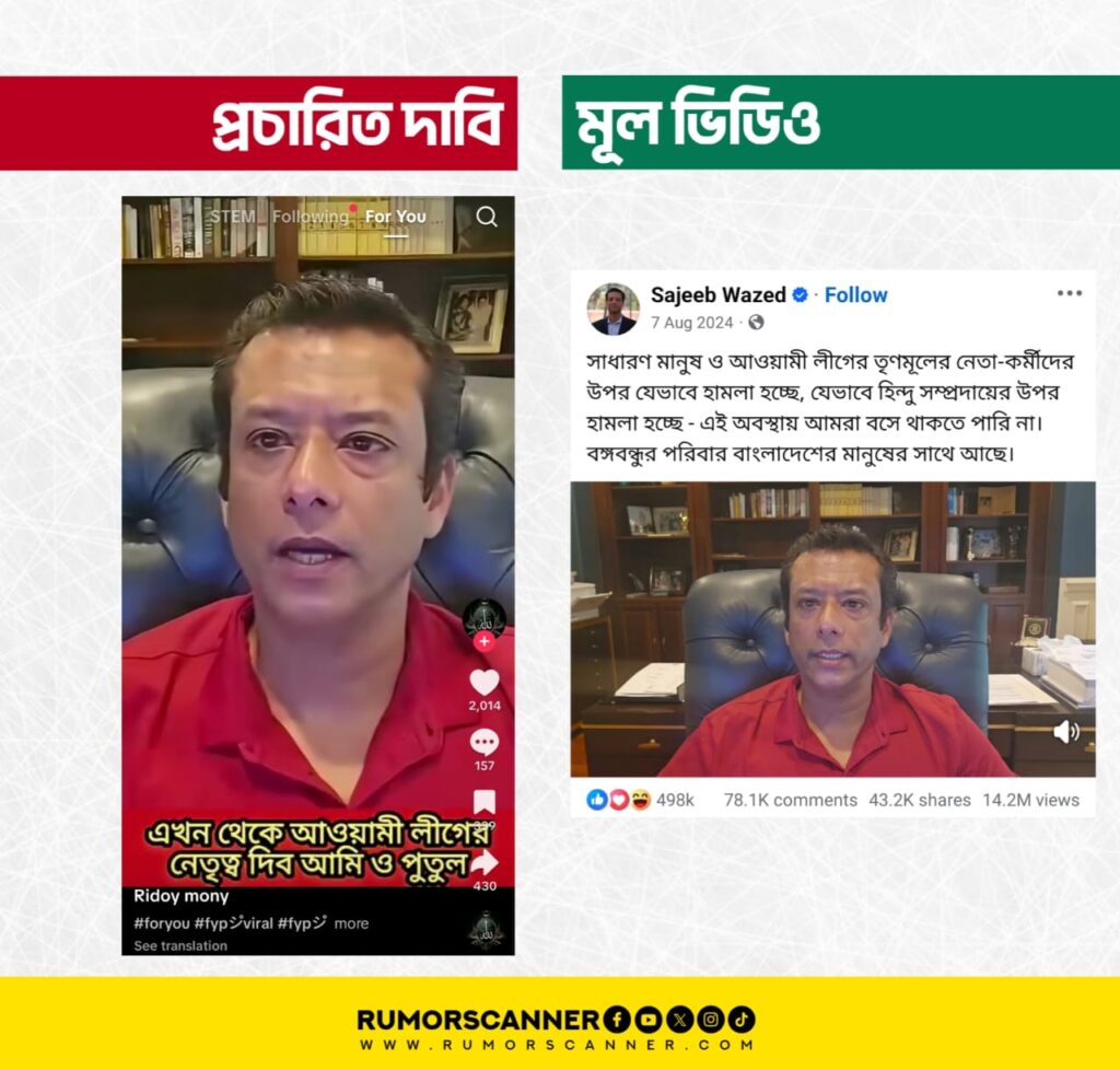 পরবর্তীতে প্রচারিত ভিডিওটির রিভার্স সার্চ করে ‘সজীব ওয়াজেদ জয়’ এর ফেসবুক পেজে ২০২৪ সালের ৭ আগস্টে প্রচারিত একটি ভিডিও পাওয়া যায়। ভিডিওটিতে সজীব ওয়াজেদ সাধারণ মানুষ, আওয়ামী লীগের তৃণমূলের নেতা-কর্মী ও হিন্দু সম্প্রদায়ের ওপর হামলাসহ নানা বিষয়ে কথা বলেন। ভিডিওটিতে প্রদর্শিত সজীব ওয়াজেদ ও তার পারিপার্শ্বিক অবস্থার সাথে আলোচিত দাবিতে প্রচারিত ভিডিওটিতে প্রদর্শিত সজীব ওয়াজেদের দৃশ্যের হুবহু মিল পাওয়া যায়। তবে ভিডিওটিতে সজীব ওয়াজেদকে আলোচিত দাবিতে প্রচারিত কথাগুলো বলতে শোনা যায়নি।