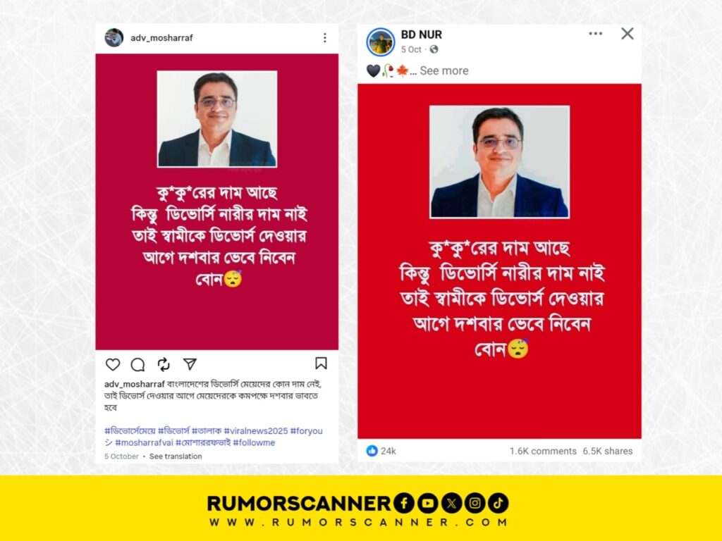 সম্প্রতি, “কুকুরের দাম আছে কিন্তু ডিভোর্সি নারীর দাম নাই তাই স্বামীকে ডিভোর্স দেওয়ার আগে দশবার ভেবে নিবেন বোন” শীর্ষক শিরোনামে টকশো সঞ্চালক ও সাংবাদিক খালেদ মুহিউদ্দীনের ছবি সংযুক্ত একটি ফটোকার্ড সামাজিক যোগাযোগ মাধ্যমে প্রচার করা হয়েছে।