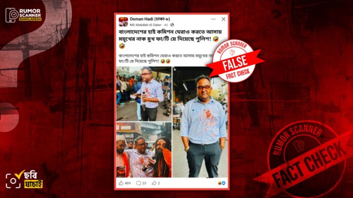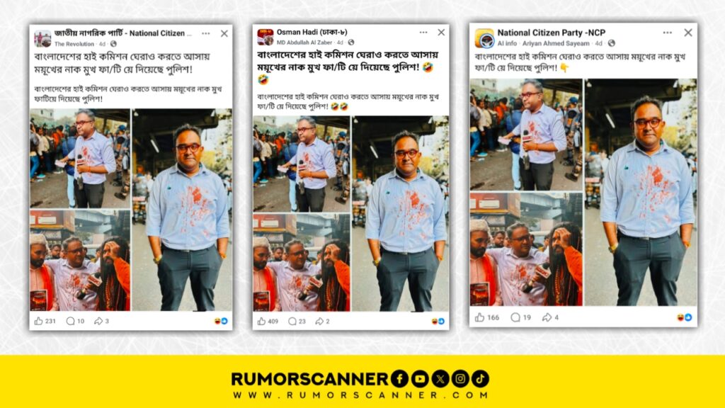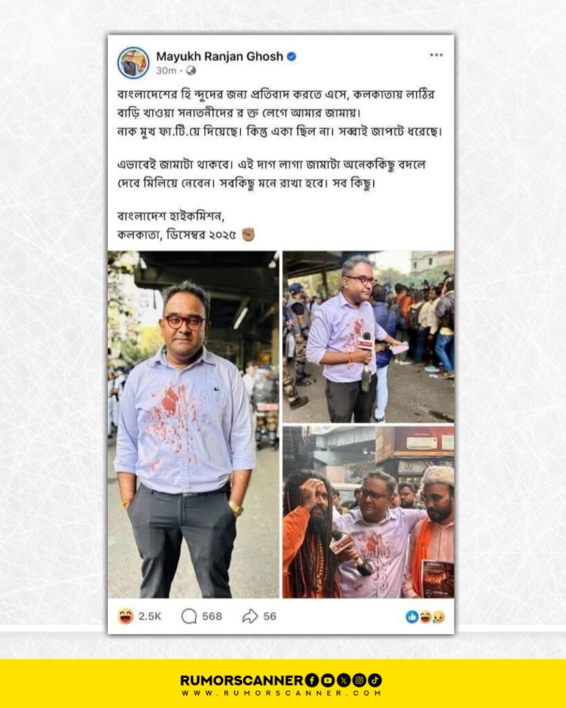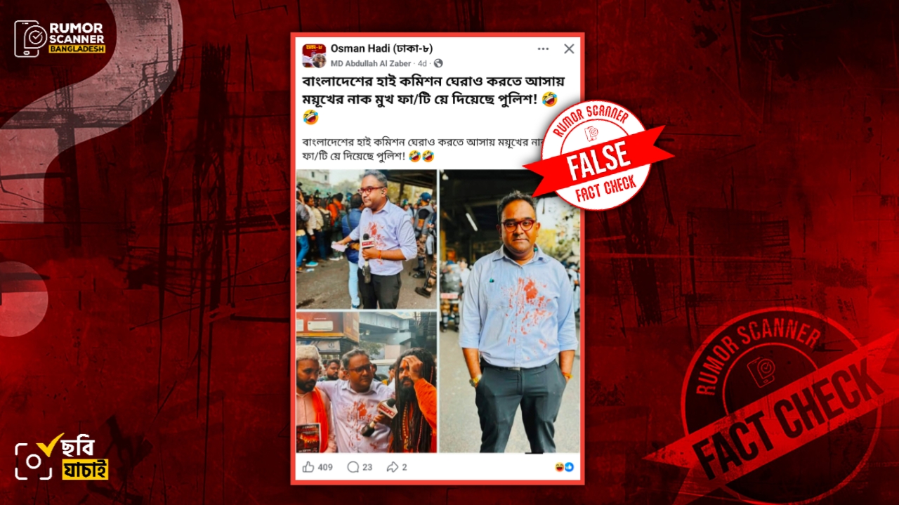 রিউমর স্ক্যানার টিমের অনুসন্ধানে দেখা যায়, কলকাতায় অবস্থিত বাংলাদেশ উপ-হাইকমিশনের সামনে বিক্ষোভে পুলিশের লাঠিচার্জে রিপাবলিক বাংলা’র সংবাদ উপস্থাপক ও সাংবাদিক ময়ূখ রঞ্জন ঘোষের আহত হওয়ার দাবিটি সঠিক নয়। প্রকৃতপক্ষে, পুলিশের লাঠিচার্জে আহত ভিন্ন এক যুবকের রক্ত ময়ূখের শার্টে লেগে যায়। সেটির ছবি তিনি তার ফেসবুক প্রোফাইলে পোস্ট করলে সেটি পরবর্তীতে আলোচিত দাবিতে সামাজিক যোগাযোগ মাধ্যমে প্রচার করা হয়।