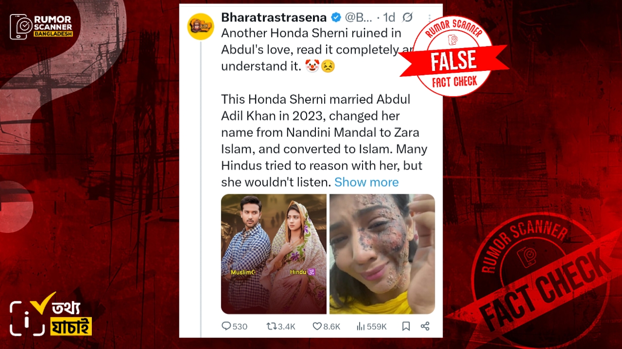 রিউমর স্ক্যানার টিমের অনুসন্ধানে জানা যায়, আলোচিত দাবিতে প্রচারিত পোস্টে উল্লিখিত পুরুষের নাম আব্দুল আদিল খান নয় এবং নারীটির নামও নন্দিনী মণ্ডল বা জারা ইসলাম নয়। প্রকৃতপক্ষে, অভিনেতা তুহিন চৌধুরী ও অভিনেত্রী জ্যোতি ইসলামের নাটকের পোস্টার ও শ্যুটিংয়ের দৃশ্যের ফুটেজ ব্যবহার করে ভুয়া দাবটি প্রচার করা হয়েছে।