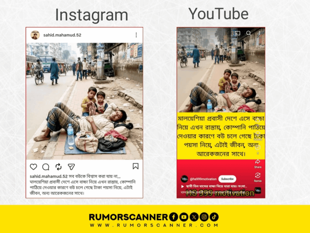 সম্প্রতি, “মালয়েশিয়া প্রবাসী দেশে এসে বাচ্চা নিয়ে এখন রাস্তায়, কোম্পানি পাঠিয়ে দেওয়ার কারণে বউ চলে গেছে টাকা পয়সা নিয়ে” শীর্ষক শিরোনাম সংবলিত একটি ছবি সামাজিক যোগাযোগমাধ্যমে প্রচার করা হয়েছে।
