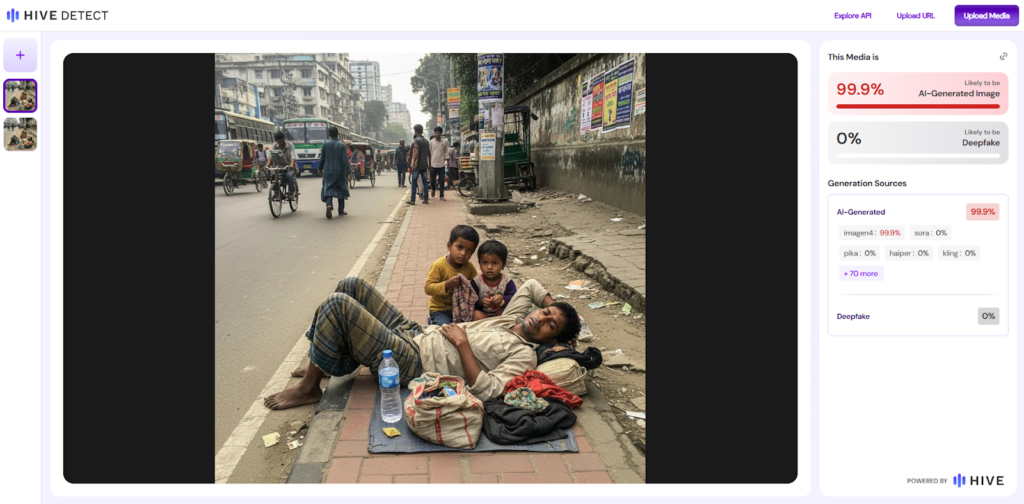 পরবর্তীতে, আলোচিত দাবি সংবলিত ছবিটির বিষয়ে নিশ্চিত হতে রিউমর স্ক্যানার ছবিটি ‘Hive Detect AI’ টুল দিয়ে পরীক্ষা করে। বিশ্লেষণে দেখা যায়, এটি এআই-নির্মিত হওয়ার সম্ভাবনা ৯৯.৯ শতাংশ।