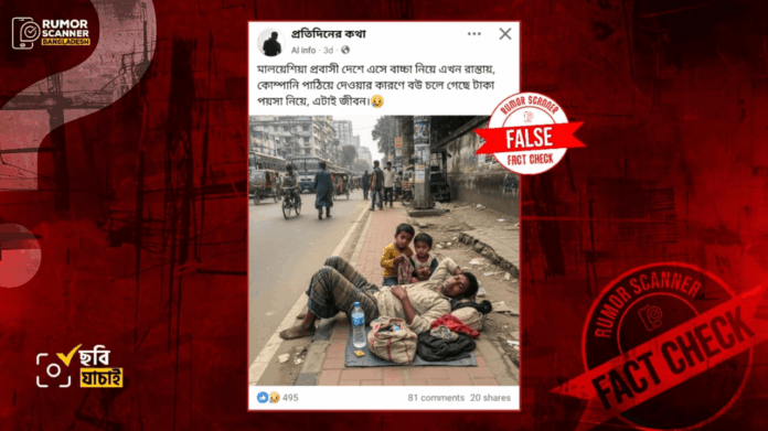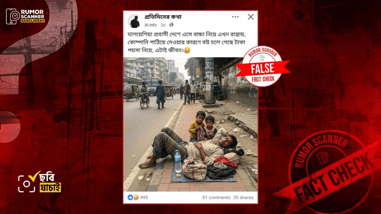 সুতরাং, এআই-তৈরি ছবিকে “মালয়েশিয়া প্রবাসী দেশে এসে বাচ্চা নিয়ে এখন রাস্তায়, কোম্পানি পাঠিয়ে দেওয়ার কারণে বউ চলে গেছে টাকা পয়সা নিয়ে” দাবিতে প্রচার করা হয়েছে; যা সম্পূর্ণ মিথ্যা।