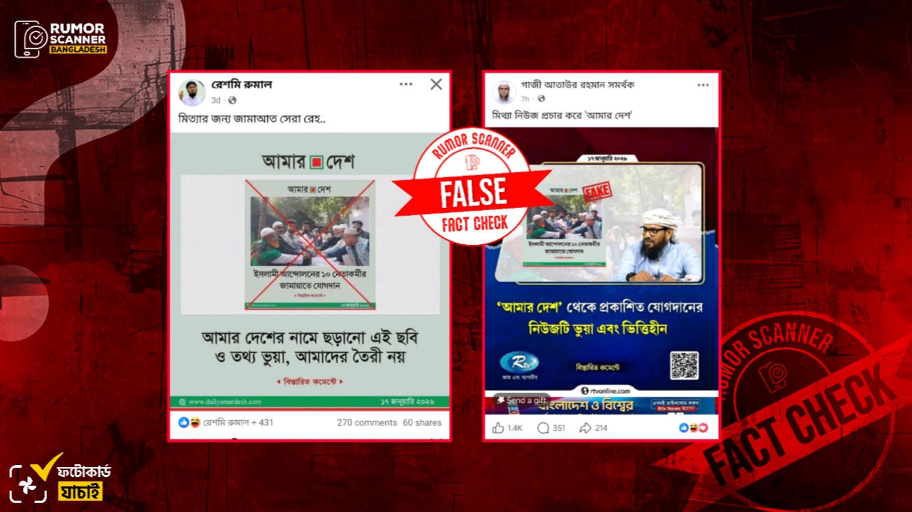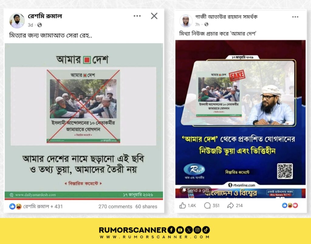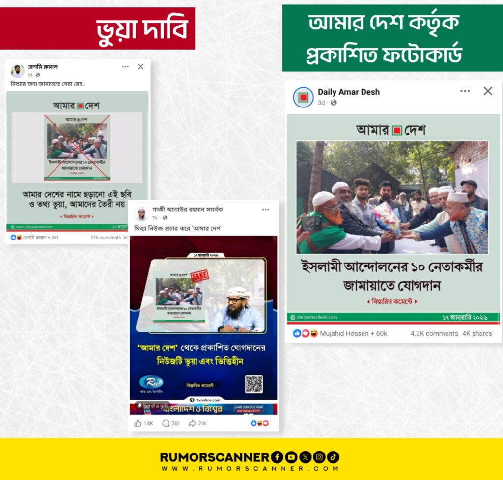 সম্প্রতি, ‘ইসলামী আন্দোলনের ১০ নেতাকর্মীর জামায়াতে যোগদান’ শীর্ষক শিরোনামে আমার দেশের একটি ফটোকার্ডকে ভুয়া এবং উক্ত ফটোকার্ডে ব্যবহৃত ছবিটিও ভুয়া দাবিতে আমার দেশেরই আদলে তৈরি একটি ফটোকার্ড প্রচার হয়েছে সামাজিক যোগাযোগ মাধ্যমে। এছাড়া, আমার দেশের ফটোকার্ডটি ভুয়া দাবিতে আরটিভিরও একটি ফটোকার্ড প্রচার হতে দেখা যায়।