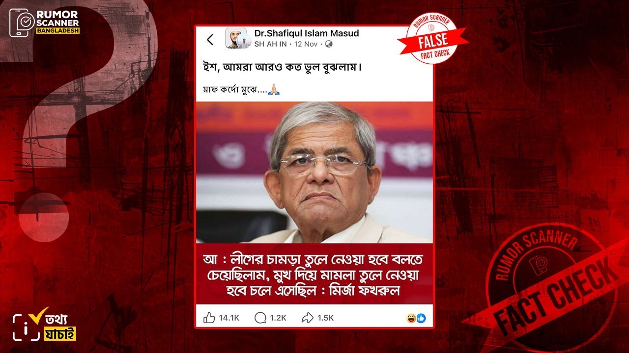 রিউমর স্ক্যানার টিমের অনুসন্ধানে জানা যায়, মির্জা ফখরুল ইসলাম আলমগীর আওয়ামী লীগকে নিয়ে এমন কোনো মন্তব্য করেননি। প্রকৃতপক্ষে, কোনোপ্রকার তথ্যসূত্র ছাড়াই আলোচিত মন্তব্যটি মির্জা ফখরুলের নামে প্রচার করা হয়েছে।