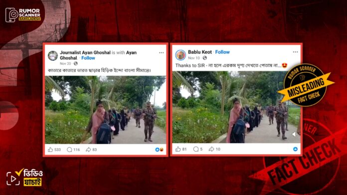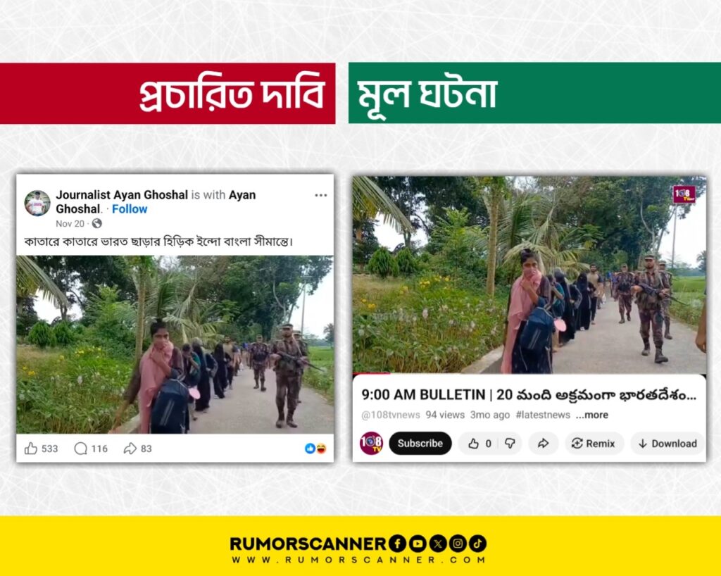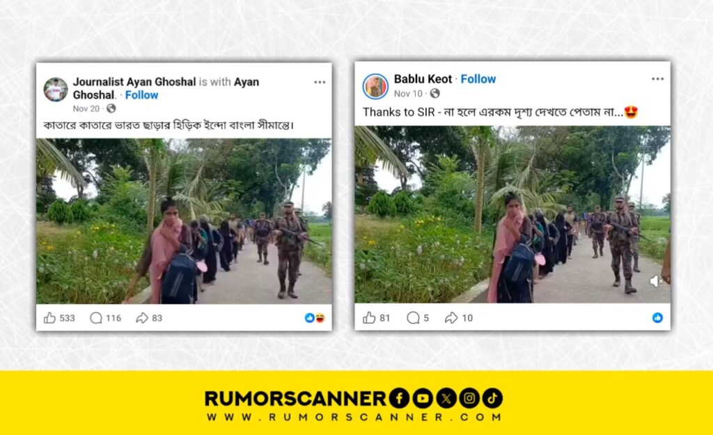 ভারতের নির্বাচন কমিশনের ঘোষণা অনুযায়ী দেশটির ১২টি রাজ্যে ও কেন্দ্রশাসিত অঞ্চলগুলোতে গত ২৮ অক্টোবর থেকে শুরু হয় ভোটার তালিকায় ‘নিবিড় সংশোধনের’ প্রক্রিয়া। যাকে এসআইআর বা স্পেশাল ইনটেন্সিভ রিভিশন নামে অধিক পরিচিত। এরই অংশ হিসেবে গত ৪ নভেম্বর থেকে পশ্চিমবঙ্গেও শুরু হয় ভোটার তালিকায় নিবিড় সংশোধন কর্মসূচি। জানা যায়, এই প্রক্রিয়ায় প্রয়োজনীয় নথি না দেখাতে পারলে বহু মানুষের নাম ভোটার তালিকা থেকে বাদ যাওয়ার আশঙ্কা রয়েছে। ক্ষমতাসীন বিজেপির কেন্দ্রীয় নেতারা দাবি করে আসছেন, পশ্চিমবঙ্গের মতো কিছু রাজ্যে বহু কথিত বাংলাদেশি অনুপ্রবেশকারী ভোটার তালিকায় নাম তুলে ফেলেছেন। ‘নিবিড় সংশোধন’ হলেই বাদ পড়বে ‘অবৈধ বাংলাদেশি’ ও ‘রোহিঙ্গারা’। এর প্রেক্ষিতে সম্প্রতি, বিপুল সংখ্যক ভারতীয় দেশ ছেড়ে কথিত ভারত-বাংলাদেশ সীমান্ত দিয়ে বাংলাদেশে প্রবেশ করছেন দাবিতে সামাজিক যোগাযোগ মাধ্যম ফেসবুকে একটি ভিডিও প্রচার করা হয়েছে। ভিডিওটিতে বর্ডার গার্ড বাংলাদেশ (বিজিবি) এবং পুলিশের উপস্থিতিতে বেশ কয়েকজন নারী ও পুরুষকে প্রবেশ করতে দেখা যায়।