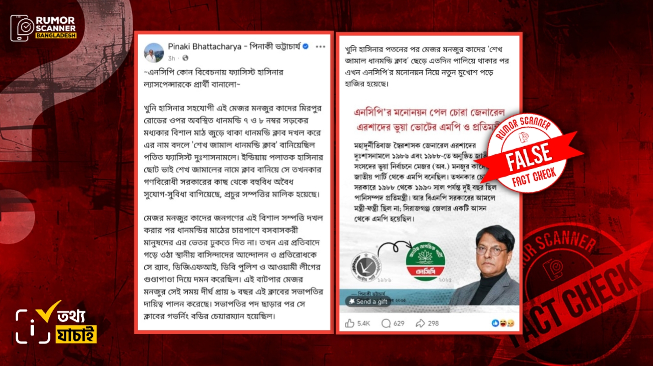 রিউমর স্ক্যানার টিমের অনুসন্ধানে দেখা যায়, সিরাজগঞ্জ -৫ আসনে এনসিপি মনোনীত প্রার্থী অবসরপ্রাপ্ত মেজর মনজুর কাদেরের ধানমন্ডি ক্লাব দখল কিংবা ক্লাবটির সভাপতির দায়িত্ব পালনের দাবিগুলো সঠিক নয়। প্রকৃতপক্ষে, শেখ জামাল ধানমন্ডি ক্লাবের সাবেক সভাপতি মনজুর কাদের এবং সাবেক সংসদ সদস্য অবসরপ্রাপ্ত মেজর মনজুর কাদের পৃথক দুইজন ব্যক্তি। মেজর (অব.) মনজুর কাদের পূর্বে জাতীয় পার্টি ও বিএনপির রাজনীতির সাথে জড়িত থাকলেও ধানমন্ডি ক্লাব দখল সংক্রান্ত দাবিগুলোর সাথে তার সংশ্লিষ্টতা নেই।